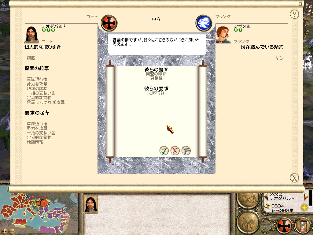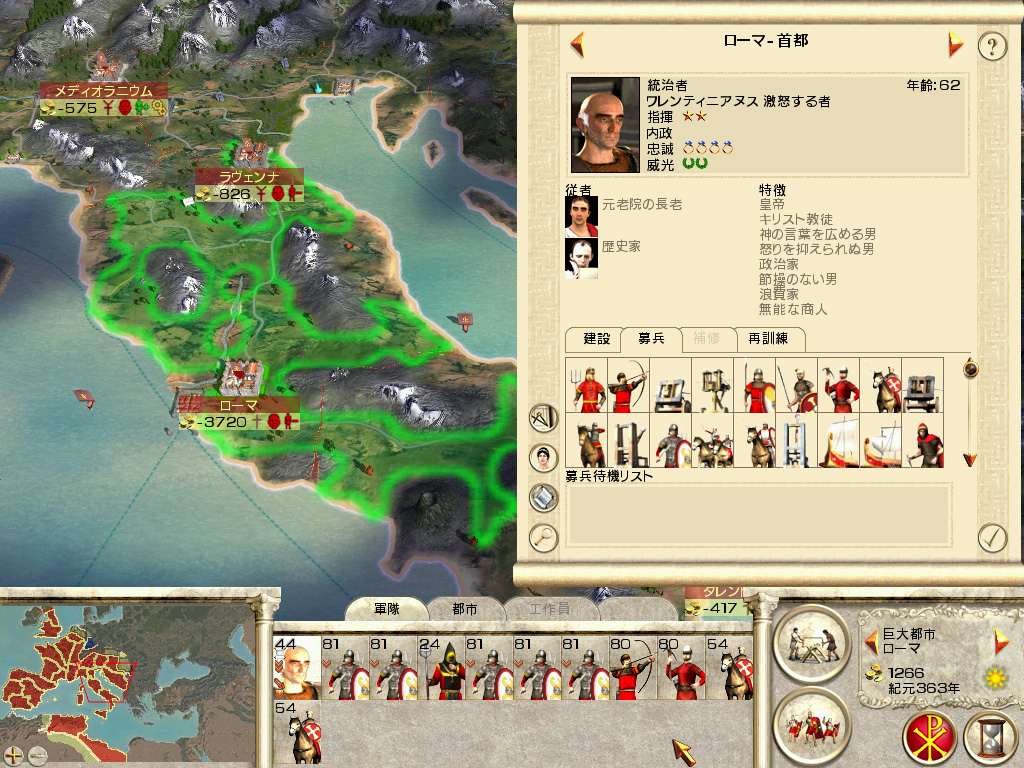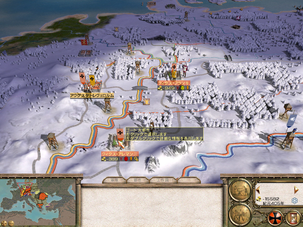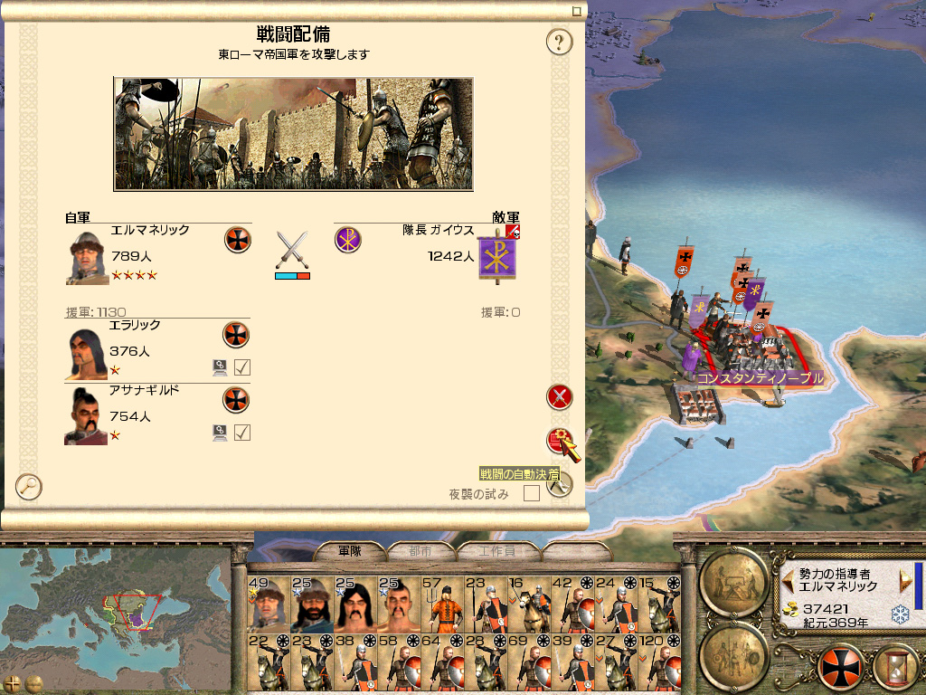では西か東のローマ帝国でプレイすればラクなのかと言えば,これまたそうでもない。西ローマ帝国でプレイを始めると,いきなり半数以上の領地で暴動や反乱が起きる寸前の状態になっている。帝国は内側から壊れ始めているのだ。東は東でこっちは宗教問題を抱えている。キリスト教を信仰する地域と伝統的な多神教を信仰する地域がちょうど半々程度。帝国内でこの二教の対立が社会不安を引き起こしてしまっているらしい。