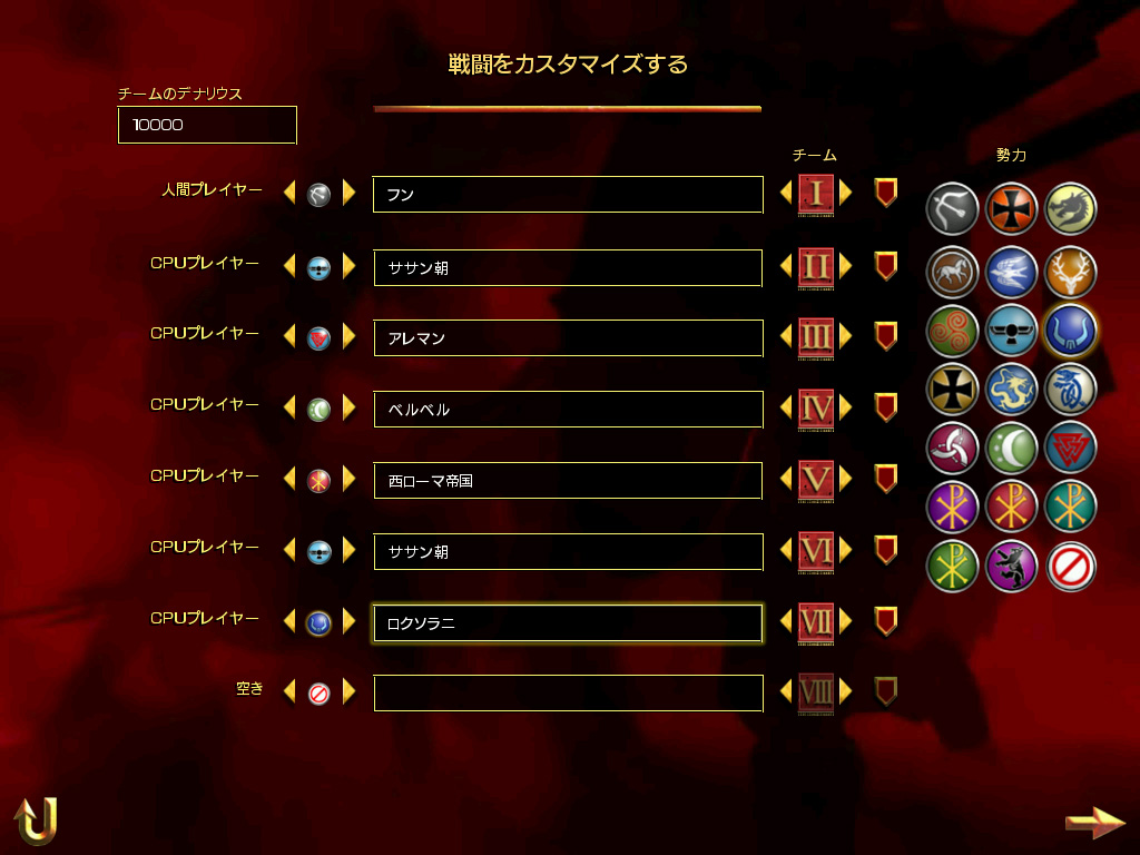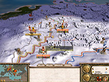 ローマ:トータルウォーのキャンペーンは「ローマが徐々に拡大していく時代」を描いたものだ。基本的にはプレイヤーはローマ(正確にはローマを構成する一勢力)を担当し,ローマが広がっていくのを楽しむゲームとなっていた。それに対し,拡張キットの新キャンペーンは「ローマ帝国の崩壊が目前に迫った時代」を舞台としている。支配地域こそ広いものの,ローマは弱っており,もはや主役ではない。プレイヤーは初めからローマ以外の多くの勢力でプレイできる。
