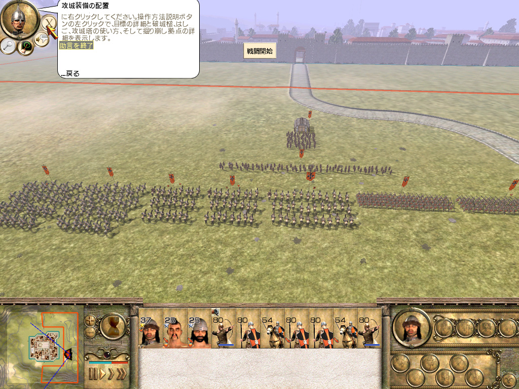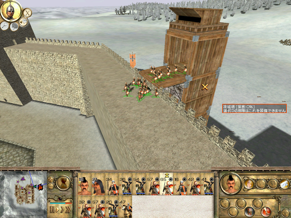| 話し合いで解決できない問題は武力で解決するしかない。兵を集め,それを率いて隣国の領地へと攻め込もう | 城攻めにはこうした攻城兵器を使用する。とくにこの攻城塔は,兵士達がエッサカ登っていく姿がなんだかほほえましくて,個人的にお気に入り | キャンペーンなしで戦闘だけを楽しみたい場合は「カスタムバトル」がおすすめ。望んだとおりの戦いをプレイできる |