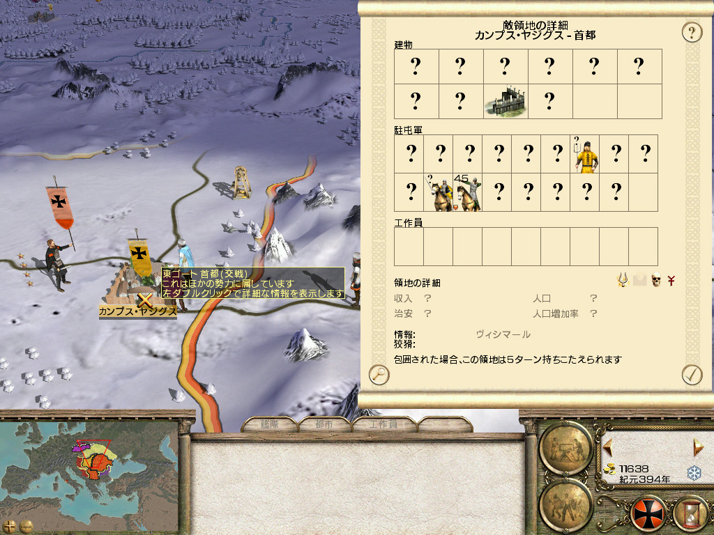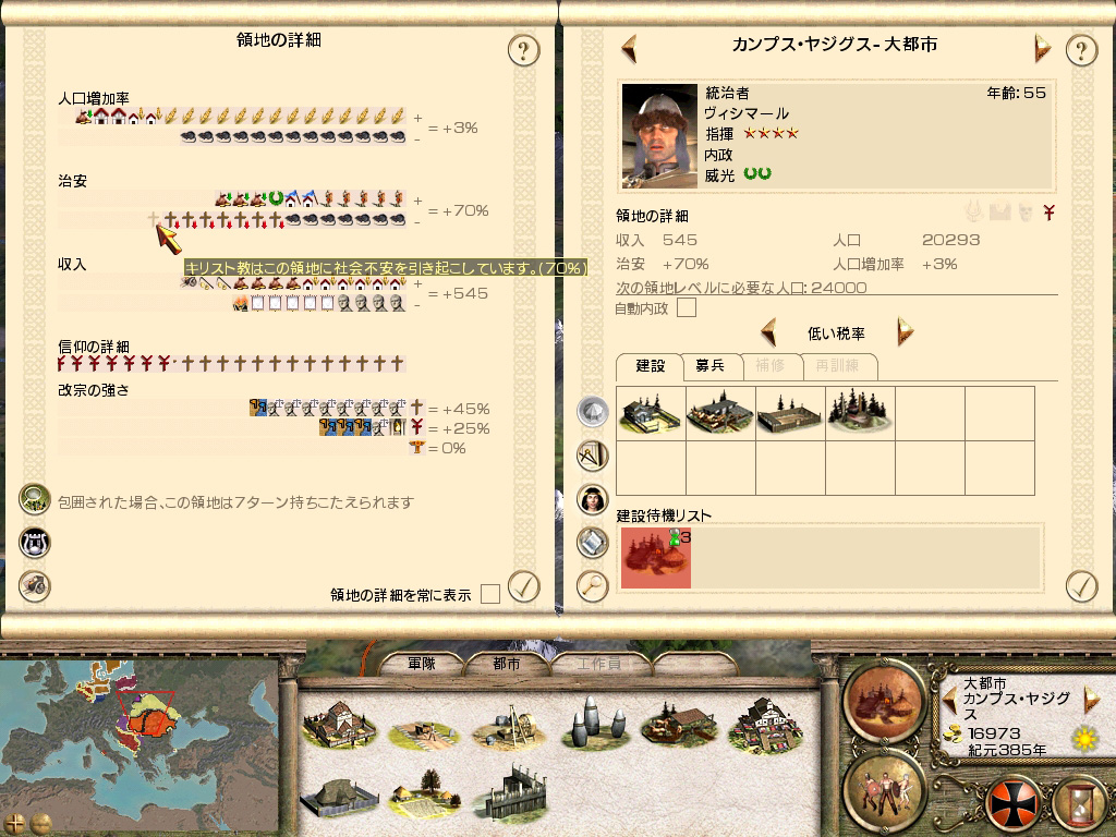 | 故郷を捨てて一時的に多くの兵隊を手に入れた移民勢力の一団。これだけの兵力があれば陥落させられない都市はまずないだろう | “領地の詳細”の画面。自然信仰が強い領地にキリスト教徒の将軍を滞在させたため,人々の間に動揺が走り,町の治安が悪化してしまった | ゴートでのプレイ中,治安の悪化を放置していたら,なんとその領地に新勢力“東ゴート”が発生。ゴートの将軍は追い出されてしまった。これも追加要素の一つである |