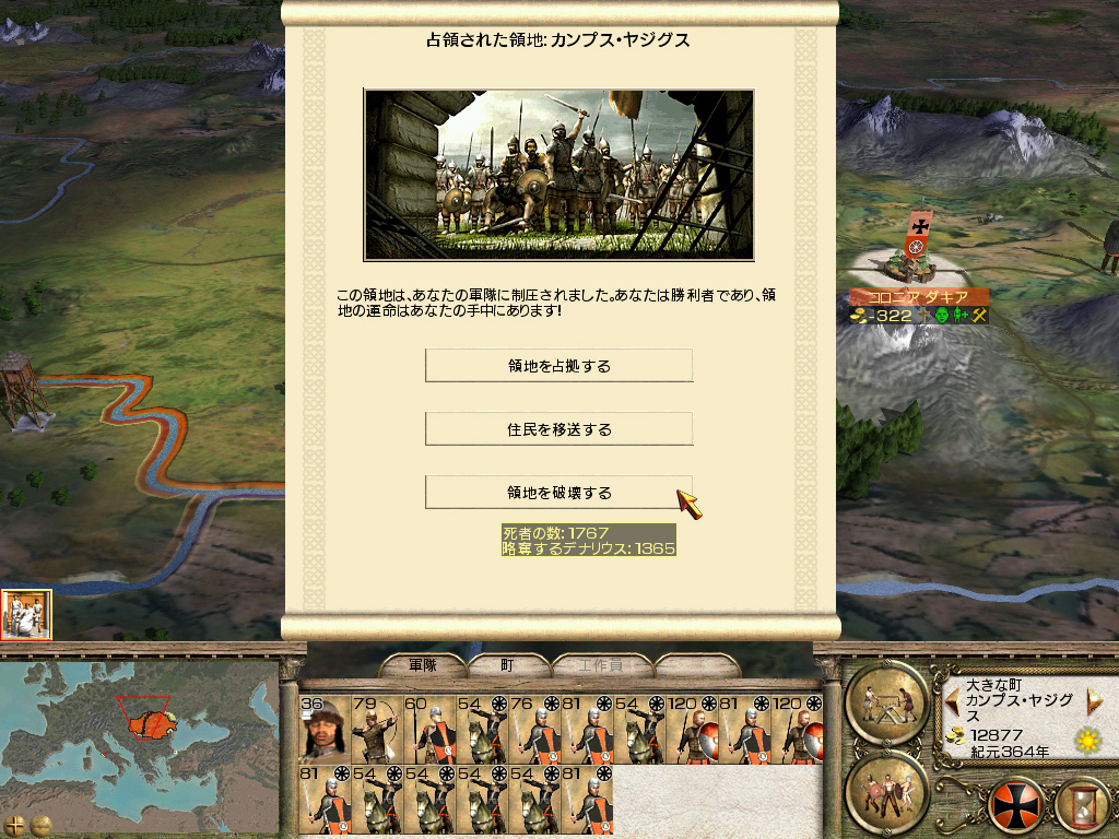 他方,積極的に移民勢力になりたくなる理由もゲームには用意されている。というのも,移民勢力になることには結構メリットが多いのである。まず移民勢力化すると兵の数がドドンと増える。これは「町に住んでいた一般人の多くが一時的に兵士になったため」という設定で,手放した最後の領地の人口にもよるが,だいたい10〜30もの部隊が突然手に入ることになる。そもそも領地を一つしか持っていないような状況ならば,その勢力には数部隊分の兵しかいないのが普通だろう。しかし移民化すれば,その状態から一瞬にして大軍団を生み出せるのである。30という部隊数は,東西ローマ帝国の首都ですら陥落させられる数字だ。さらに,移民勢力となっている間は,軍の維持費がいっさいかからないという特別な恩恵まで受けられる。定住せずに,コスト0の大軍団を率いて,いくつもの町に襲いかかり略奪してまわるという,まさに蛮族的なプレイがこの拡張キットで体験できるのだ。