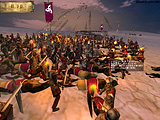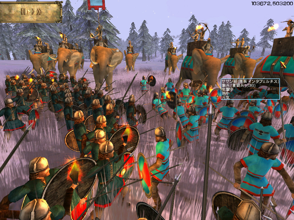 | 拡張によって追加された“シルトロン隊形”。防御力は大きく上がるが,移動力が激減する | “象兵”。馬ごと人を踏みつぶす破壊力のほか,周囲の敵部隊に恐怖を与えて,その士気を低下させる能力も持つ | 破壊された城門から領内になだれ込む兵士達。攻城戦は基本的に防御側が有利だが,圧倒的な戦力差の前にはかなわないことも…… |