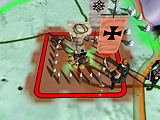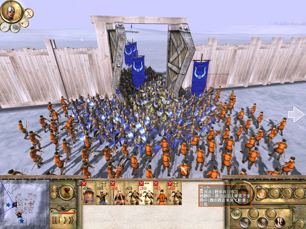 | 領地に攻め込まれた場合,町の中央広場を巡る攻防戦になる。侵入側がここを一定時間占拠すると領地は陥落する | “士気”はトータルウォーシリーズの戦闘における最重要要素の一つ。さまざまな要因が兵士達の心に影響を与えていく | 士気が低下するとやがて部隊は敵に背を向けて敗走を始める。ここに追撃を加えられると部隊は深刻なダメージを受けてしまう |