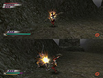 アクションは,非常に簡単な操作で行える。攻撃ボタンを連打することで連続技が出せ,これだけでも敵をサクサク倒していける。が,本作の本作たるところは,無双ゲージが溜まると出せる"無双乱舞"だ。これは格闘ゲームにおける必殺技,超必殺技のようなもので,ボタン一発で発動し,周囲の敵をまとめて吹き飛ばしてくれる。エフェクトもド派手で,多くの敵がきりもみ回転しながら吹き飛んで行く様はまさに気分爽快。通常連続技から無双への連携がズバッと決まった日にはもう,小さくガッツポーズしたくなるほどの快感が味わえる。