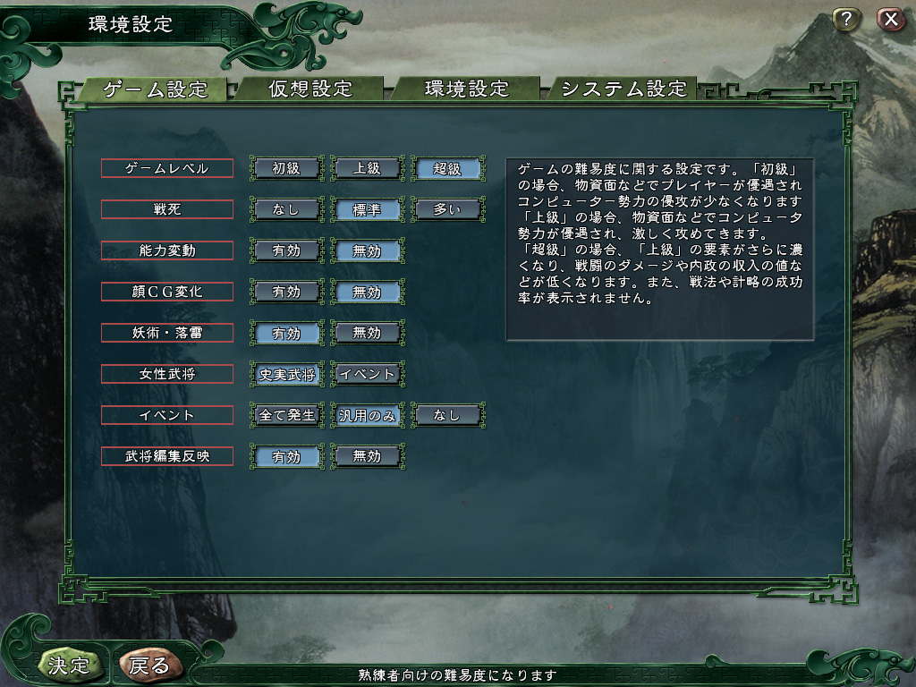 | 中国語だった武将のかけ声などが,日本語に変更可能になった。「環境設定」から「ボイス言語」で設定ができる | 最高の難度「超級」が追加された。今までの難度では物足りないというプレイヤーは,ぜひ挑戦してみよう | 内政に影響を及ぼす,新たな技巧が追加された。従来の技巧同様,「技巧研究」コマンドで研究,強化が可能だ |