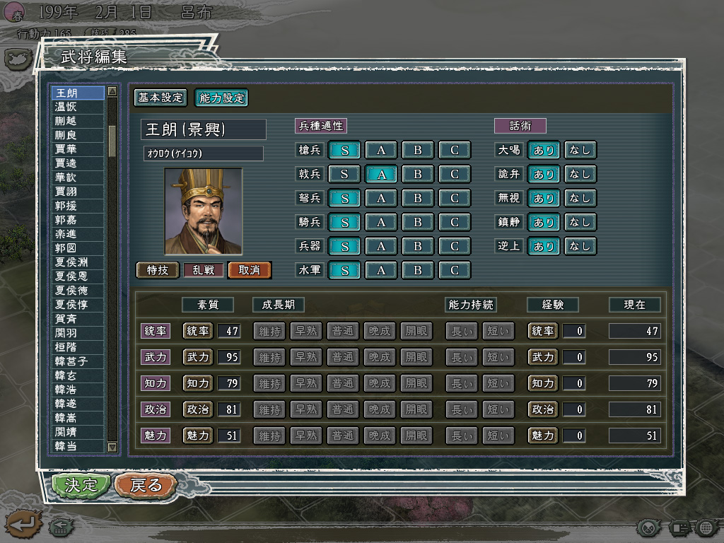 プレイヤーはまず,能力研究によって,「能力資格」を獲得する必要がある。能力資格は,大きく分けて3種類。「武+5 低」や「統+5 中」など,武将の基本能力値を高めるもの,「騎兵A」や「水軍B」など,兵種適性を上げるもの,「鉄壁」や「論客」など,新たな特技を与えるものだ。能力資格を獲得したら,今度はそれを「武将育成」で自勢力の武将に与えることにより,武将の能力をアップできる。