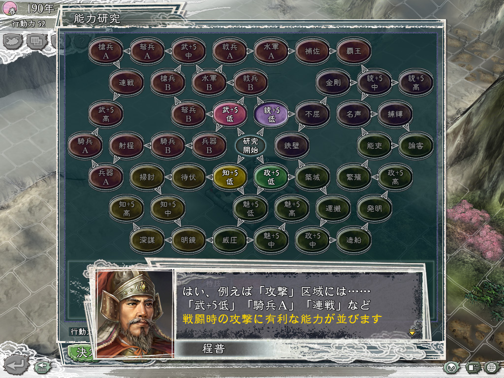 「能力研究」は,「技巧研究」と違い,コマンド実行に武将は必要ない。ただし,一つの資格を研究するたびに,3〜6か月の時間がかかってしまう。また,「武将育成」には30日の期間を要し,その間その武将には命令は与えられない。