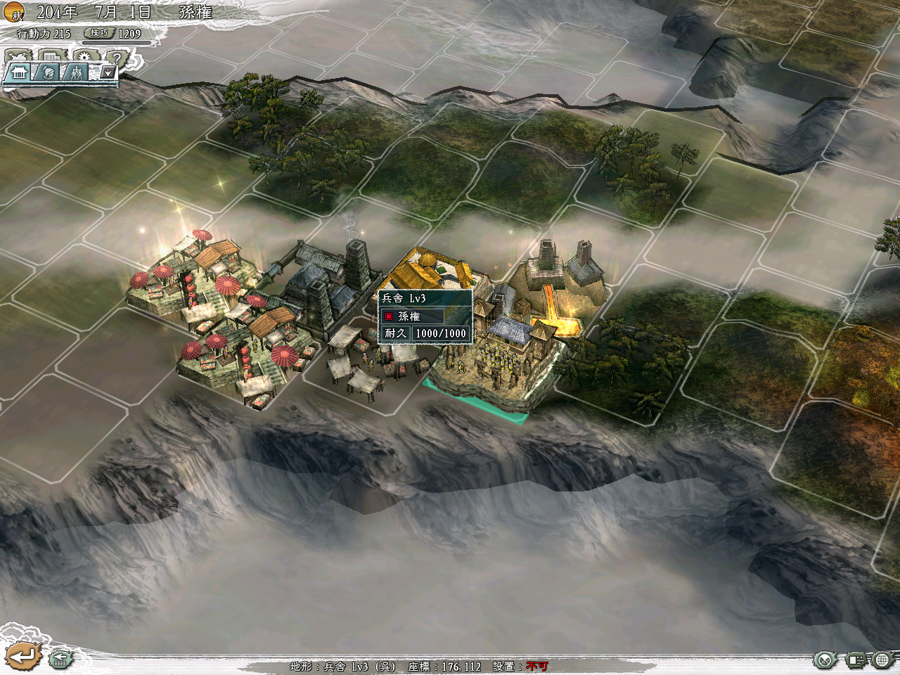 合併可能な施設は,市場,農場,兵舎,鍛冶,厩舎の5種類。また,レベルは3までしか上がらない(初期状態は1),吸収される側の施設はレベル1のものだけに限る,といった制限がある。このため,施設を建てる位置や,合併する順番など,さまざまな点に気をつけながら開発していく必要がある。深く考えずに開発をしていると,合併不可能な位置に低レベルの施設を残してしまうこともある。十分に注意したい。