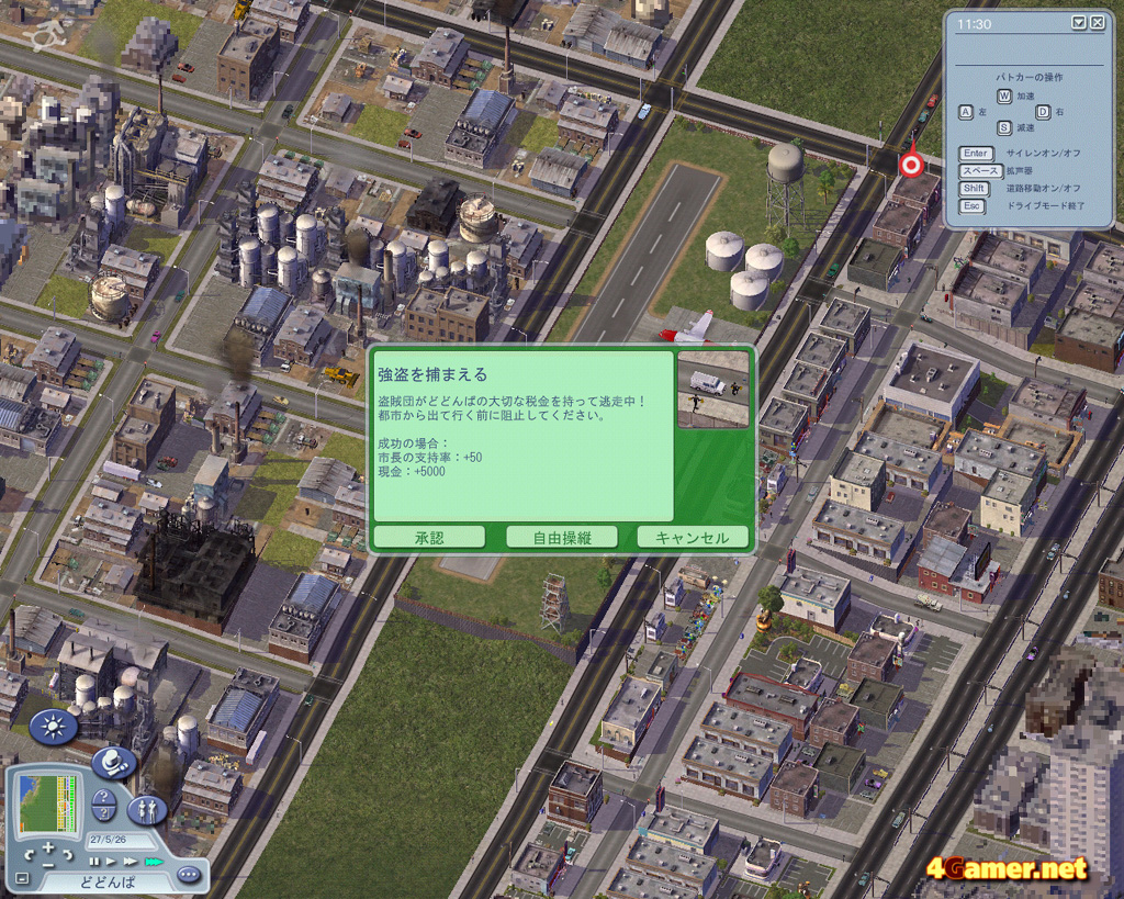 | 自由に運転モードの"悪ミッション"。成功すると,高額の報酬と引き替えに市長の支持率が下がる | こちらは"良ミッション"。報酬は少ないが,成功すれば支持率もグンとアップするので,何が何でもミッションクリアすべし | パトカーや消防車を使うときは,サイレンを鳴らせば前を走る車が道を空けてくれる。交差点などでは拡声器を使わないと,気付かない車と衝突するので注意しよう |