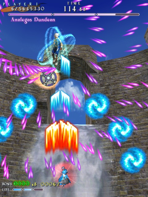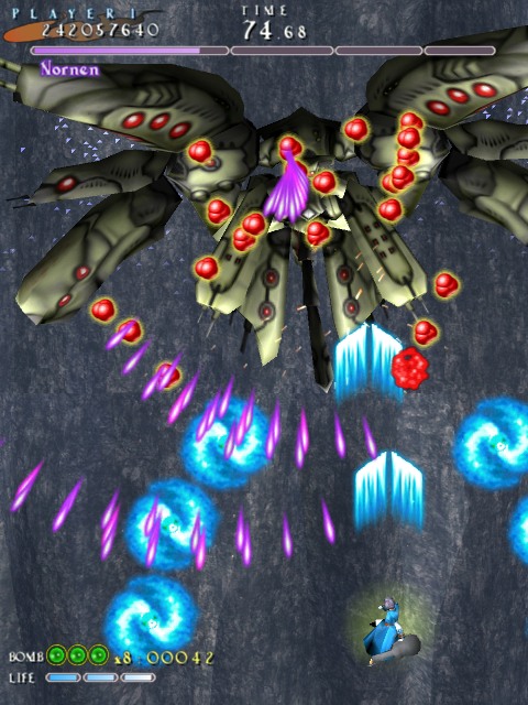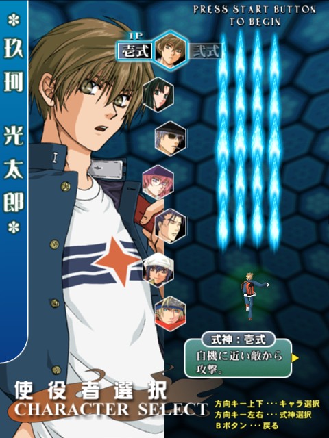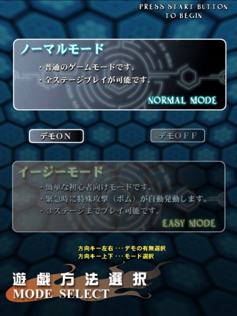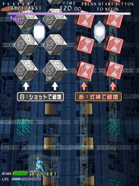 基本はいたってオーソドックスな縦画面/縦スクロールシューティングであり,レバー/十字キーによる移動に加え,通常攻撃とボム(=緊急回避)の2ボタンを使う。ただし,実際には攻撃ボタンの連打/長押しによって,ショットと「式神攻撃」を使い分け,これに対応する形でショット"連射"ボタンと通常ショット(→式神)ボタンを定義できるので,実質3ボタンとも考えられる。それにしても操作自体はかなりシンプルだ。