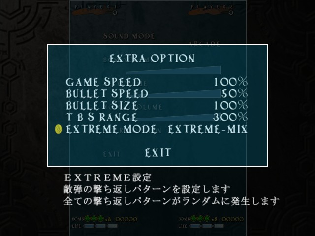出現条件は伏せられているが,何度もプレイしていると出てくる[EXTRA OPTION]設定。極端な設定にすると,とてもプレイできなくなるので注意。弾が画面を埋めつくすのを見て,絶望感を楽しむならアリだが |