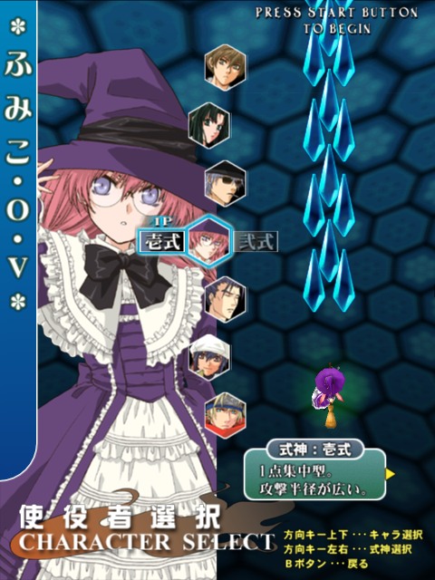 ほかのシューティングゲームと比べて,キャラクター間の違いはかなり大きく,その選択によってプレイ感覚が根本から変わる。初めてプレイするときは,まず一通りのキャラクターと式神を使ってみて,自分に合ったものを探すことから始めたい。まあ,キャラクターに思い入れを持つのも楽しみ方の一つなので,外見優先で巫女やメガネ魔女に決め打ちしてもいいし,熱血主人公やイカレたアメリカン忍者など,個性を重視するのもよいだろう。