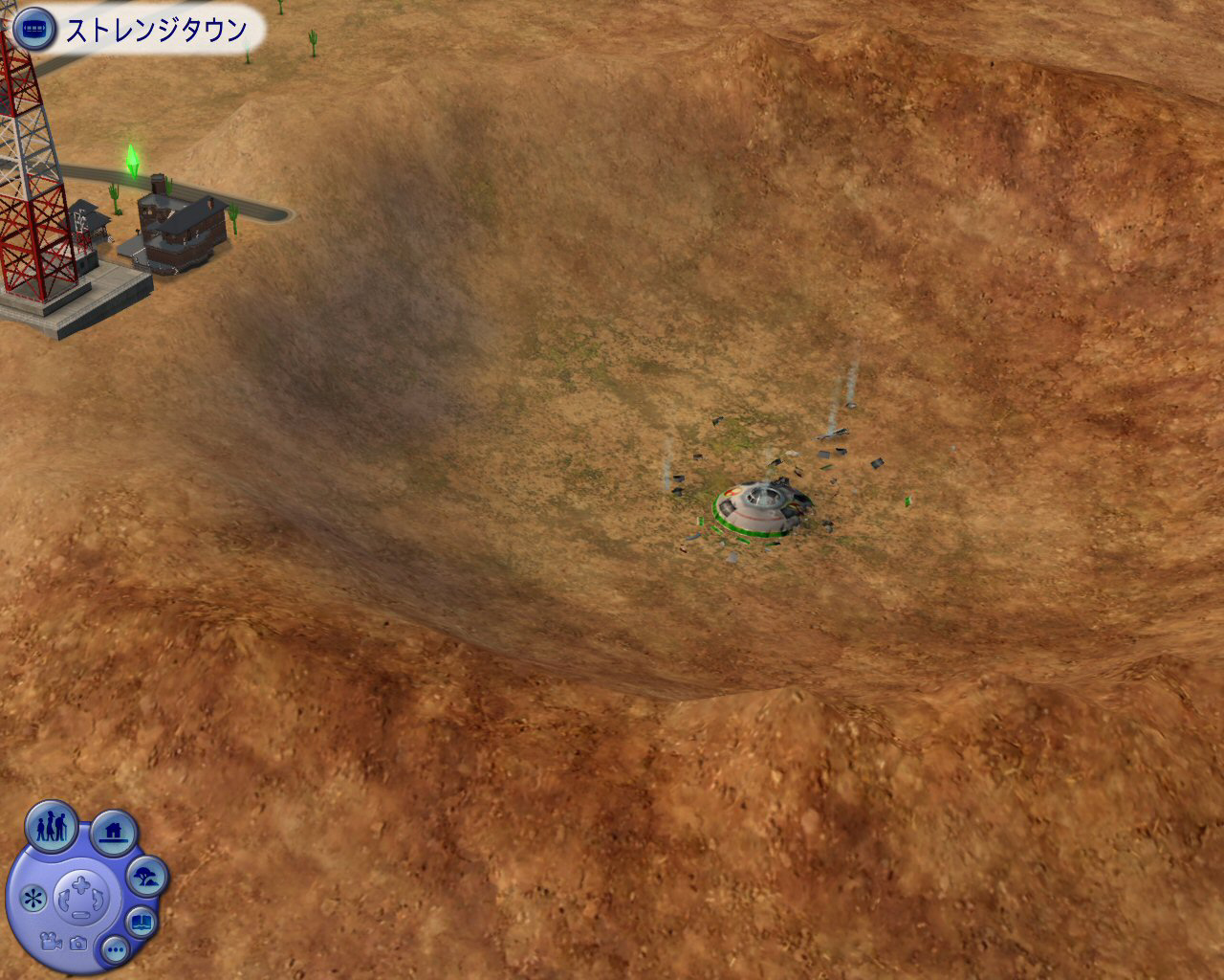| 用意された三つの町にはそれぞれ物語がある。それを解き明かすのがプレイヤーの使命,というわけではない | 3Dで描かれた町の中から,一軒を選んで彼らの生活に介入する。自分で家族を作ることだってもちろん可能 | ストレンジタウンの郊外にはUFOの残骸。町には緑色をした住人もいたりする。だからどうってことはないけど |