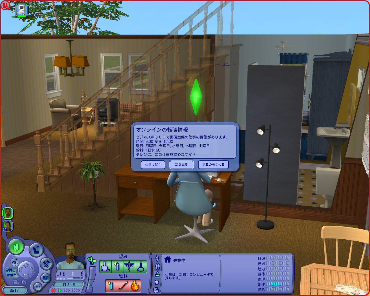 | 彼らの言葉"シム語"は理解不能。吹き出しがある程度参考にはなるが,要するに話の内容は重要ではないのだ | 友達を誘って公共施設に遊びに行ける。とはいえその数は少なく,もっといろいろな施設がほしいところ | 職探しはネットと新聞で可能。ネットを使うためにはPCが必須。なので,何はともあれ1台買っておこう |