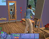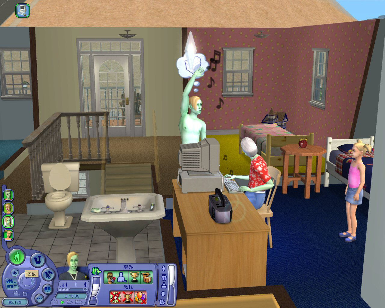 家具などのディテールの緻密さは半端でなく,よく見ると,衣装戸棚の中やディッシュウォッシャーの内部など,あまり目に付かないところもしっかり作り込まれている。またプレイヤーの分身となるシム人の制作も細部に渡って可能で,眉の形や顎の線など,まさに自分だけのシム人を作れる。まあ,実際にやってみるとなかなか思った通りの顔にはなってくれないが,ともかく苦労して作った自分だけのキャラクターが生活する様子を見るのはたいそう面白い。