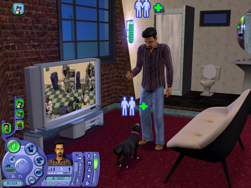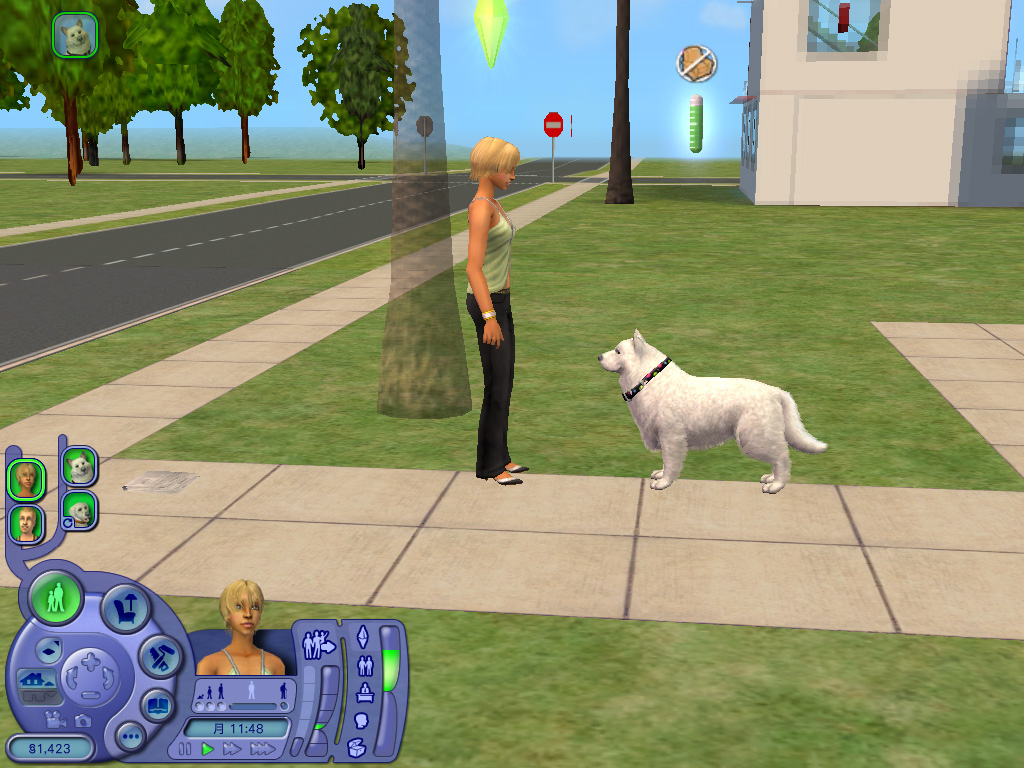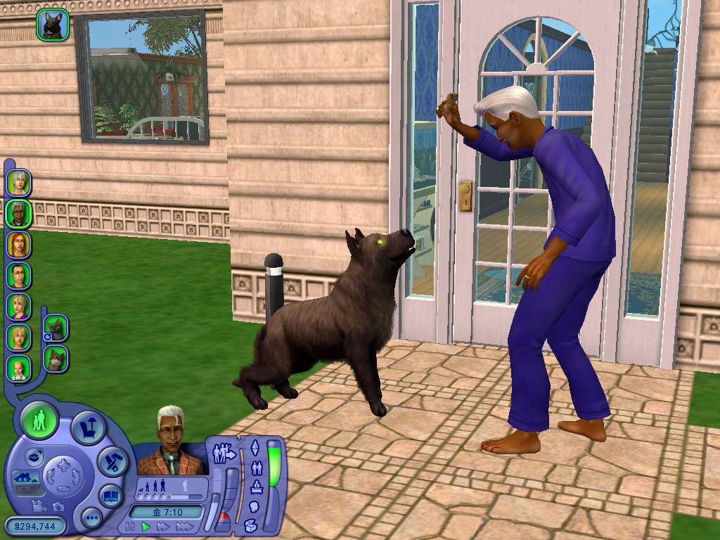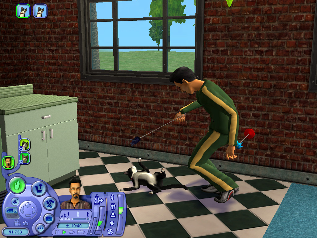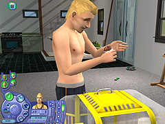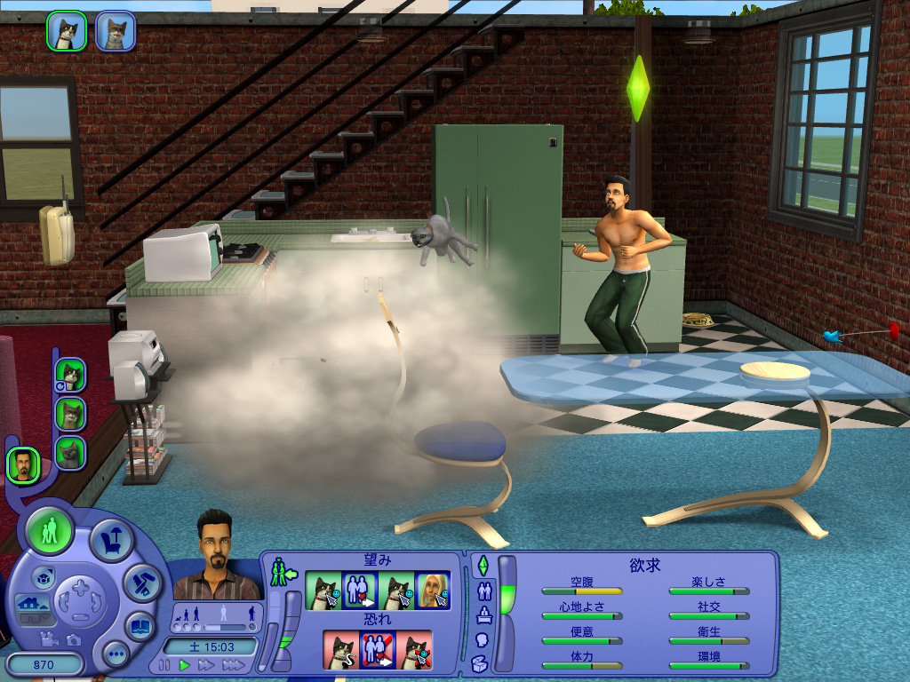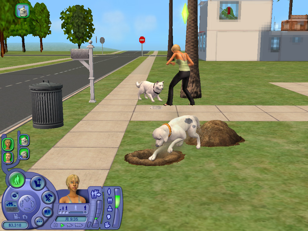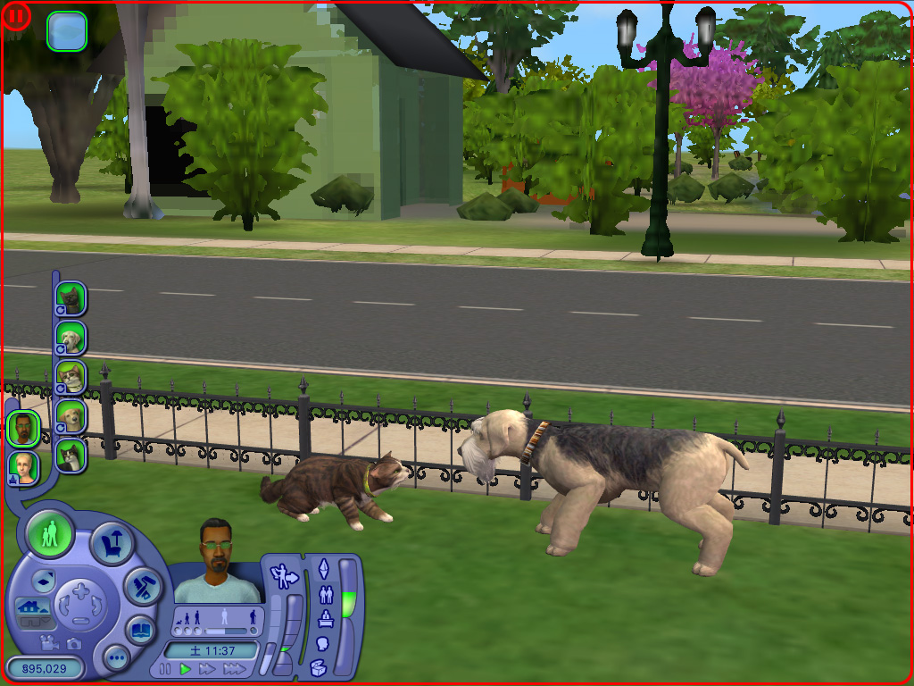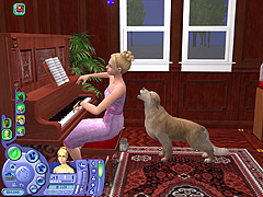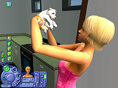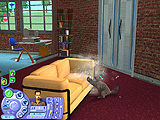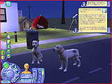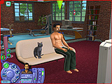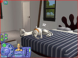 どのペットも一つ一つのしぐさが実にリアルで,いたずらするときの表情や,シム人に叱られたときのしょんぼり具合など,本当によく再現されている。また,シムシリーズの醍醐味というのは,プレイヤー側の操作コマンドには存在しない,シム人やペットの自由な動きを観察することにあったりする。シム人と共におもちゃで遊ぶ猫も十分に可愛いが,ちょっと目を離した隙に背中を床にこすりつけて猫がうねっていたり,犬が水溜りに飛び込んで暴れていたりと,予想外のしぐさを見せてくれるのだ。