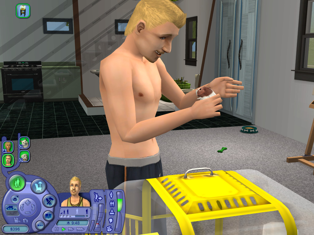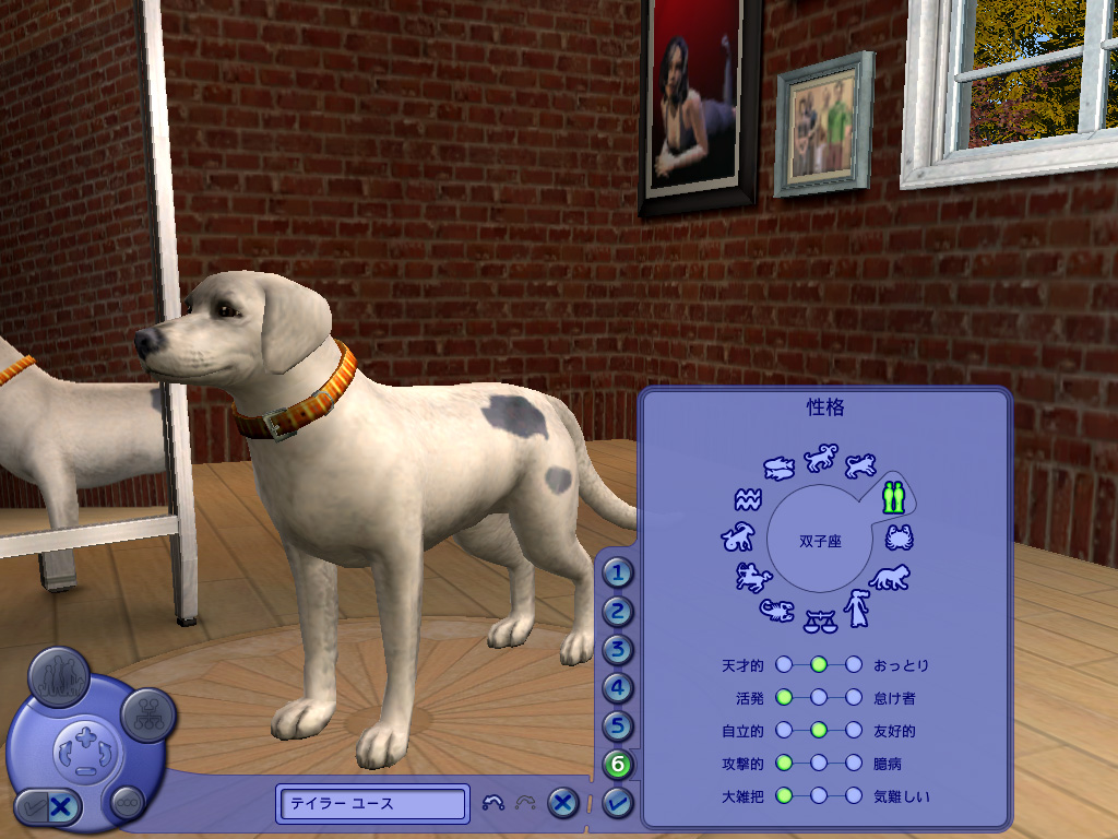 ゲーム内時間で3日ほど経過すると,子犬は突然誕生する。シム人の場合は陣痛らしきものに顔をゆがめ,赤ちゃんがポーンと空から降ってくるシーンがムービーで見られるのだが,ペットの場合は唐突というかシンプルというか,いきなり床の上に子犬が現れる。