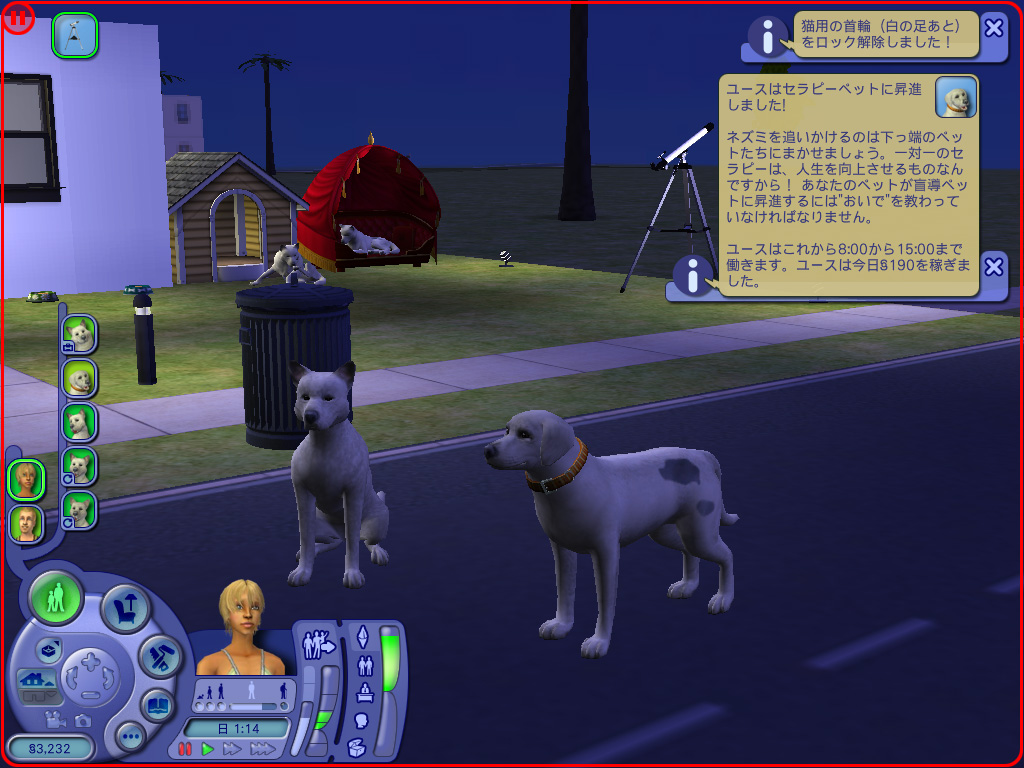 まあ,シム人の職業に比べれば昇進の段階も少なく,もらえる金額も少ないが,ペットがキャリアの頂点を極めると「シム・ギフトコード」のロックが解除され,新しい柄の首輪やボディカラーが出現するというメリットもある。この首輪やボディカラーのギフトコードは共有可能なので,ザ・シムズ2をプレイしている友人がいるならば,お互いに持っていないコードを交換し合うのもいいだろう。
