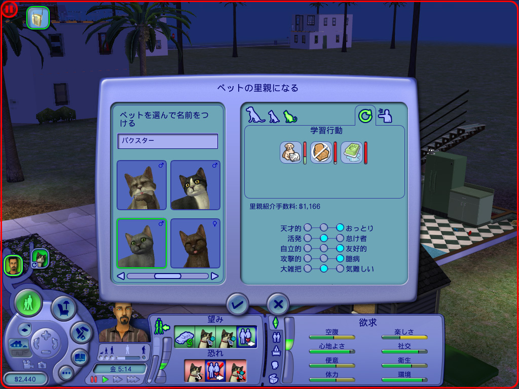 首輪の色,目のサイズや耳の大きさ,尻尾の形に至るまで,事細かにカスタマイズしたら,最後に性格を決定。複数のペットを飼う場合,後々この性格がかなり大きく影響する。相性の悪いペット同士の場合,頻繁に派手な喧嘩騒ぎを起こすから始末が悪い。とくにオスとメスを同時に飼って,いずれは我が家に子犬や子猫を……と夢見ているならば,2匹の組合せは相当慎重に考えよう。かなり苦労させられることもあるからだ。