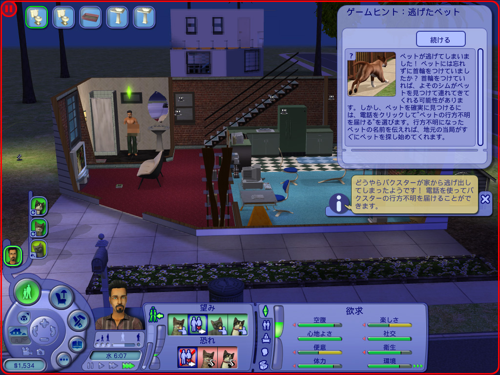 このほかにも,ランダムで家に遊びに来るNPCペットと仲良くしておけば,NPCペット相手に「子犬/子猫を作る」命令を出すことも可能。しかしシム人と違い,ペットは電話をかけて自宅に招待できないし,遊びにくるタイミングも気まぐれなので,ちょっと難しい。