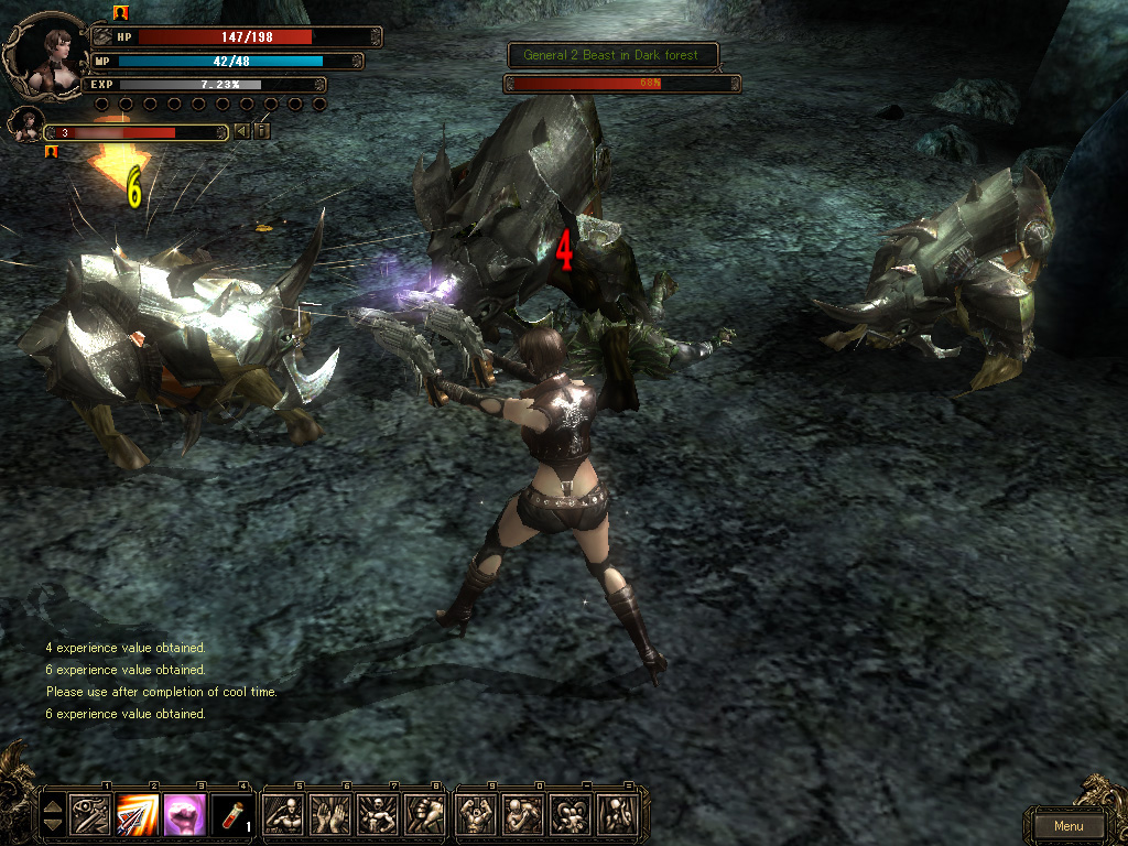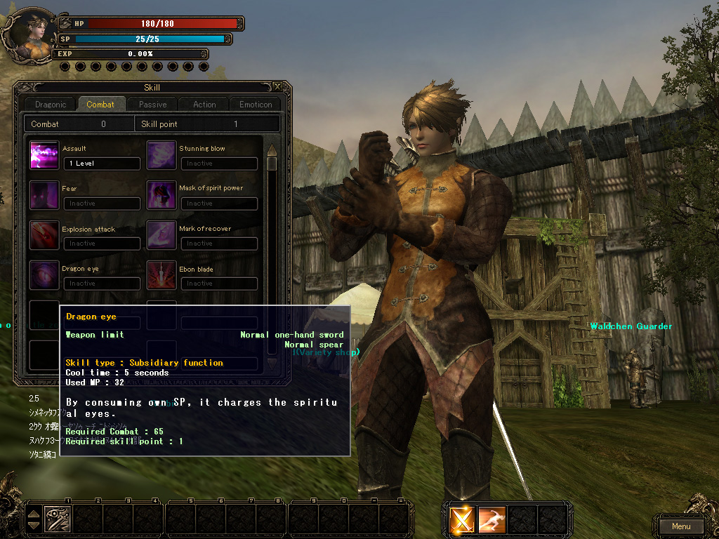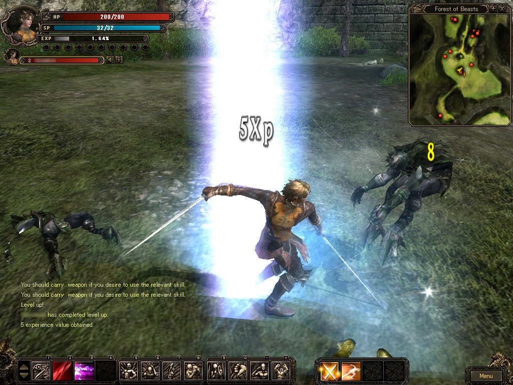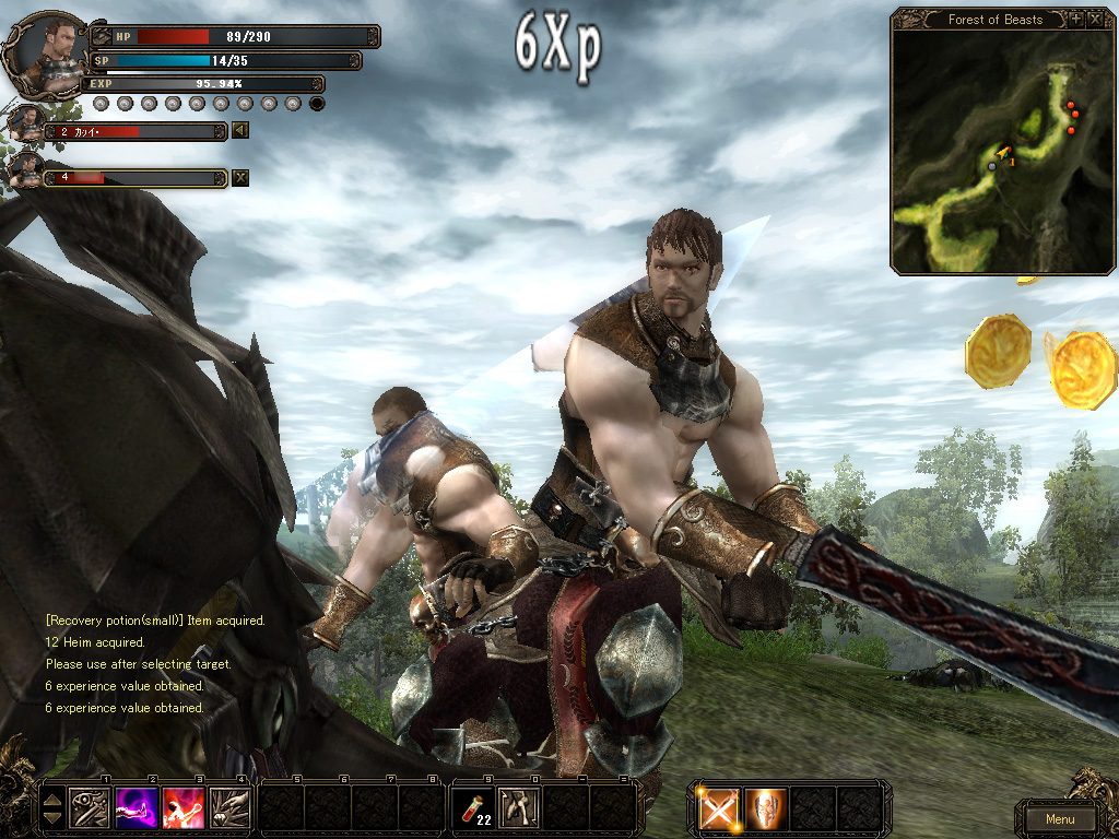 | ドラゴンナイトは近接アタッカーという位置づけのクラス。ヒット&アウェイの戦術が好きな人にはお勧めできそうだ | 二刀流の状態で,敵に斬りかかるスキル「Assault」を使った瞬間。このように,スキルごとのアクションには見応えがある | スキル使用に必要なポイント「SP」は,ドラゴンナイトは時間の経過と共に蓄積していく。同じ近接クラスでも,方向性は微妙に違う |