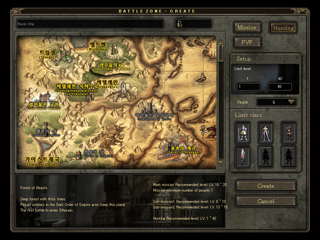もう一つ重要なのは「エリア種別」で,場所により参加可能なキャラクターレベルが異なってくる。ちなみに,現在実装されているBattlezoneのエリア種別には,森林をテーマとした「Forest of Beasts」と,薄暗いダンジョンの「Underground Waterway」の2種類がある。