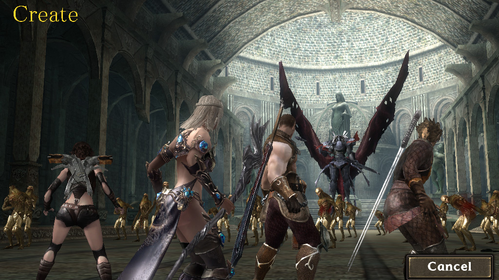| 現時点で作成できるクラスは4種類がある。このキャラクター作成画面は凝ったデザインだが,奥に鎮座ましましているのはボスだろうか? |