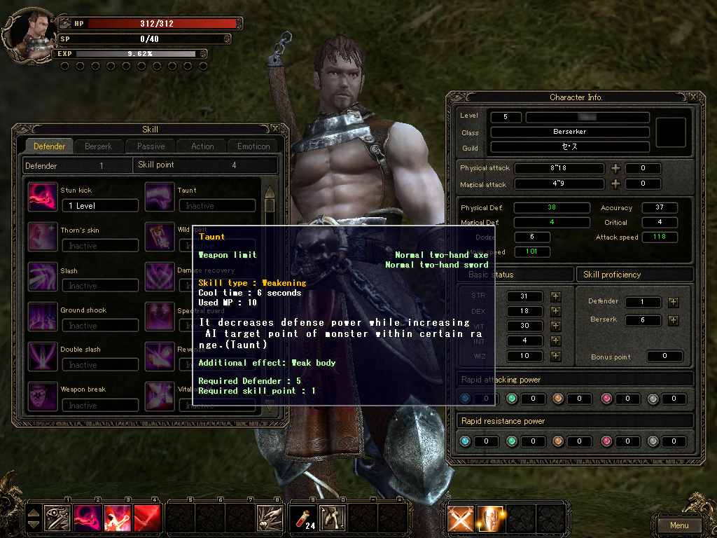 バーサーカーを例にとってSkill Proficiencyを見てみると,防御関連のスキルが詰まった「Defender」と,攻撃関連の「Berserk」の2系統がある。Defenderに5ポイント割り振ると,新たなスキル「Taunt」(挑発)が習得可能となる。もう一方のBerserkに5ポイント割り振った場合は,「Bash」(敵を弾き返す)が習得可能になるといった具合だ。これらSkill Proficiencyに属するスキル数は,現時点でそれぞれ10〜20前後あり,今後はさらに増えそうな雰囲気である。
