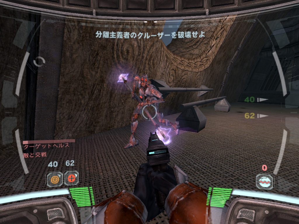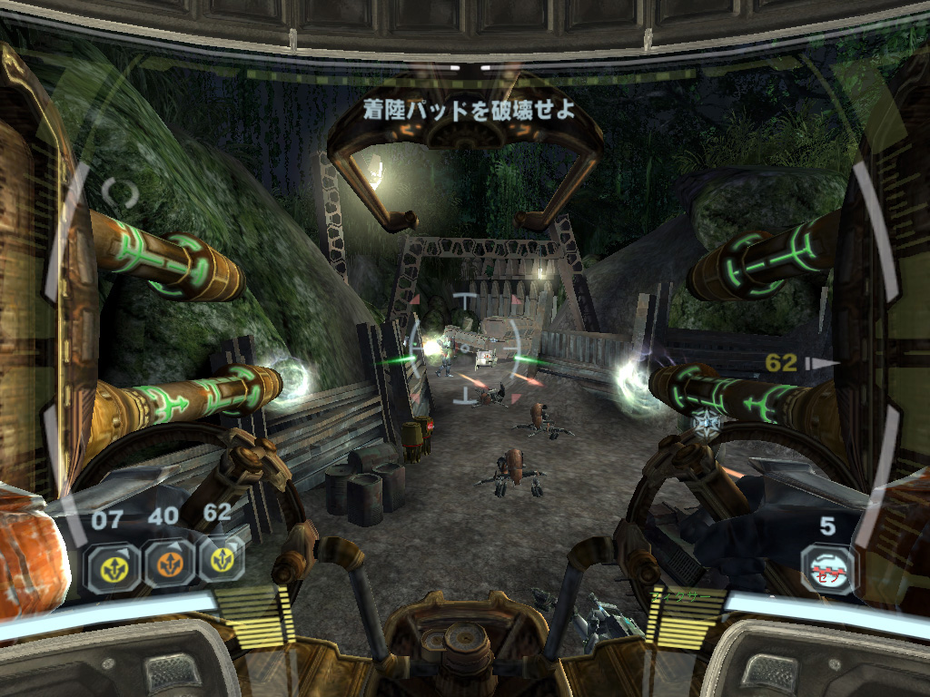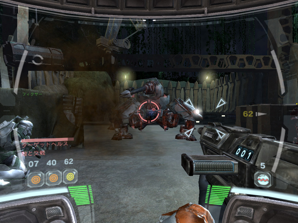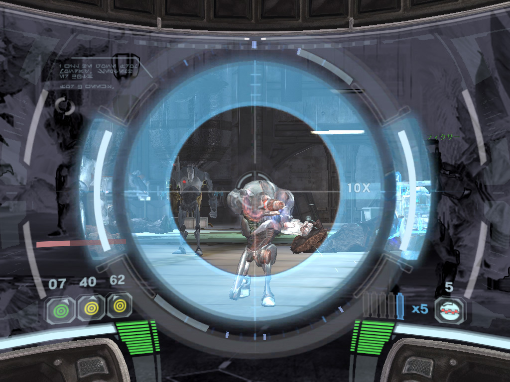 | 狙撃用アタッチメントのスコープは倍率を2段階に切り替えられる。狙撃できる場所は限られるが | 謎のマグナガード・ドロイド。非常に機敏な動きで動き回り,かなりやっかいな敵だ。見た目も恐い | ヘルメットの汚れは自動的に拭われる。敵の体液が飛び散っても平気? なのでガンガン殺せ! |