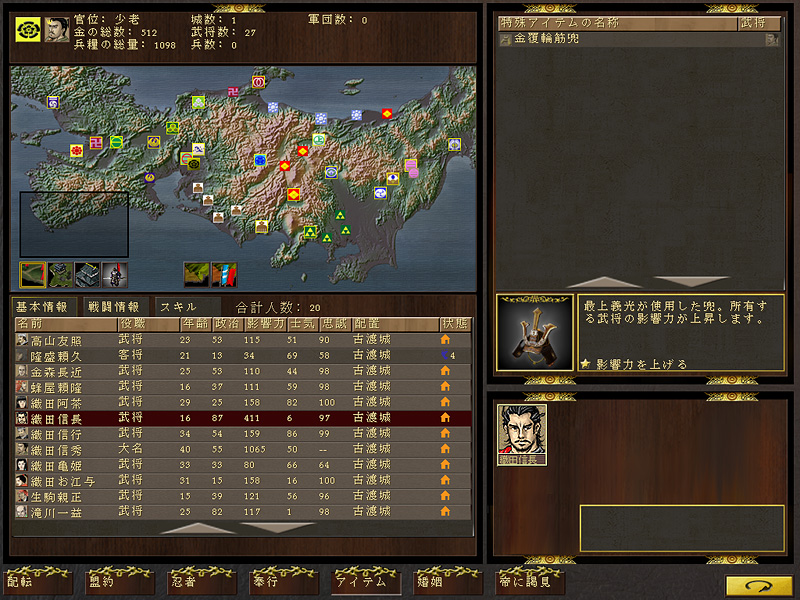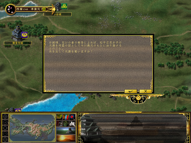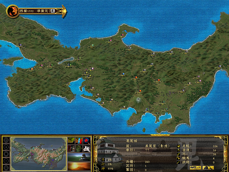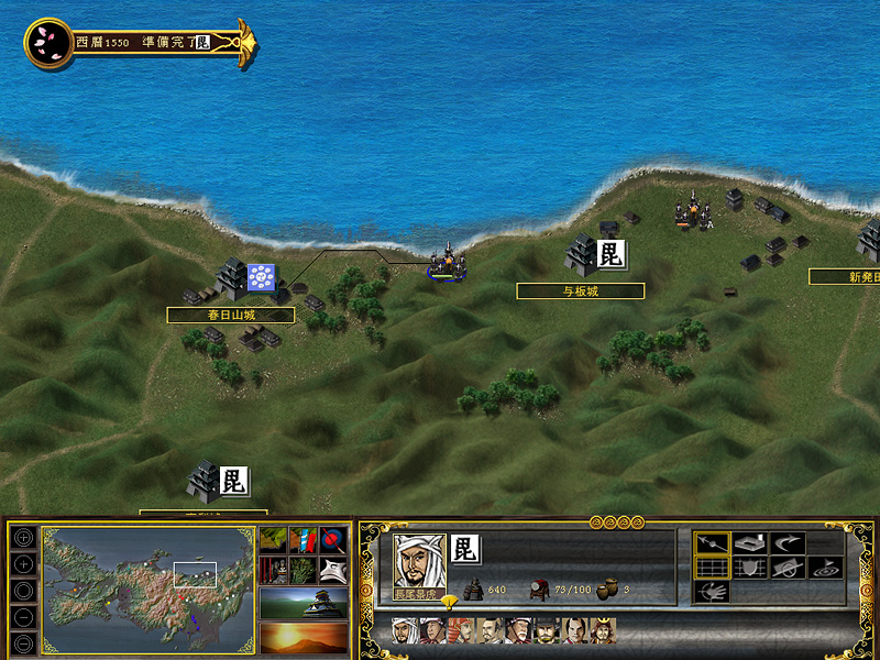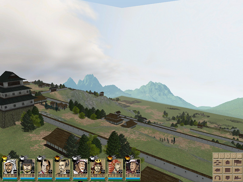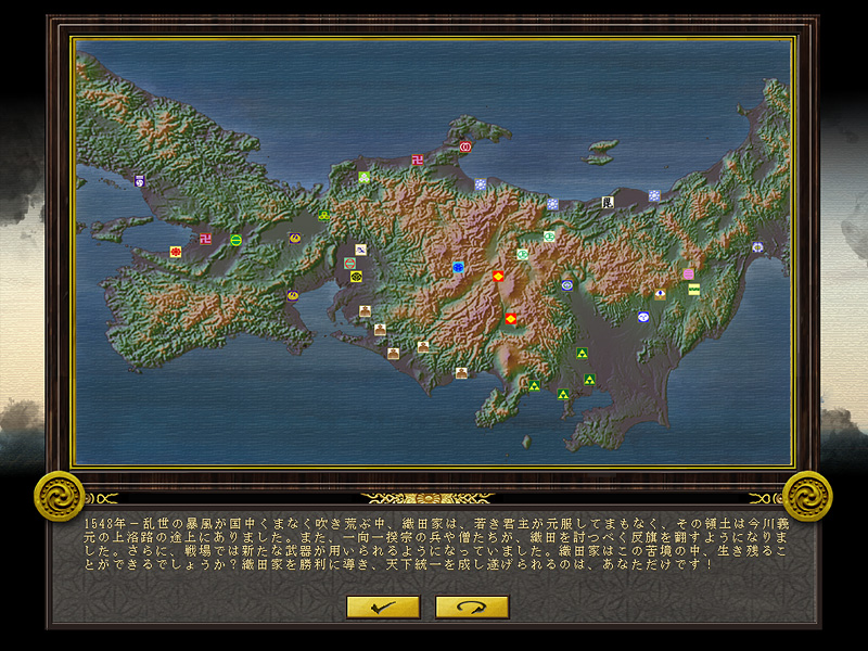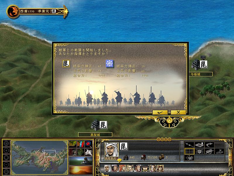| カナダ生まれとはいえ,日本語版なので安心して遊べる。デザインもとことん和風だが,背景の山が少し異国風? | 信長の野望シリーズに大きく影響を受けているのは間違いない。顔グラフィックスの類似性はちょっと心配ではあるが | 日本全国はカバーしておらず,東は伊達氏の岩切城から西は赤松氏の姫路城まで。毛利あたりまでは欲しかった |