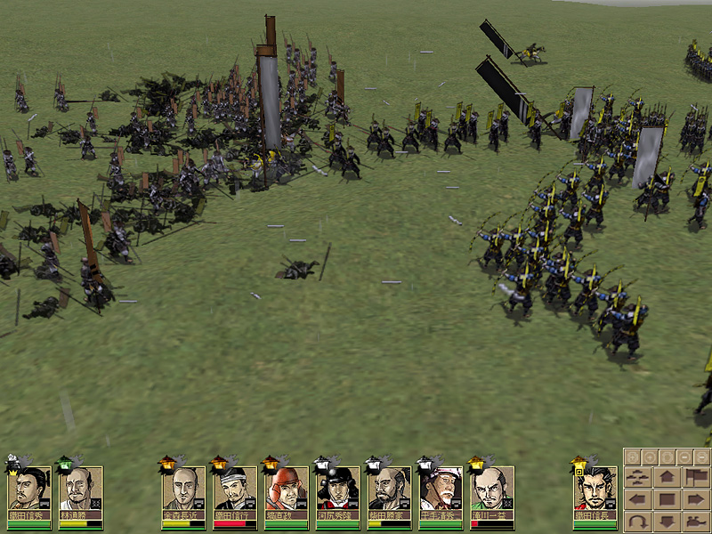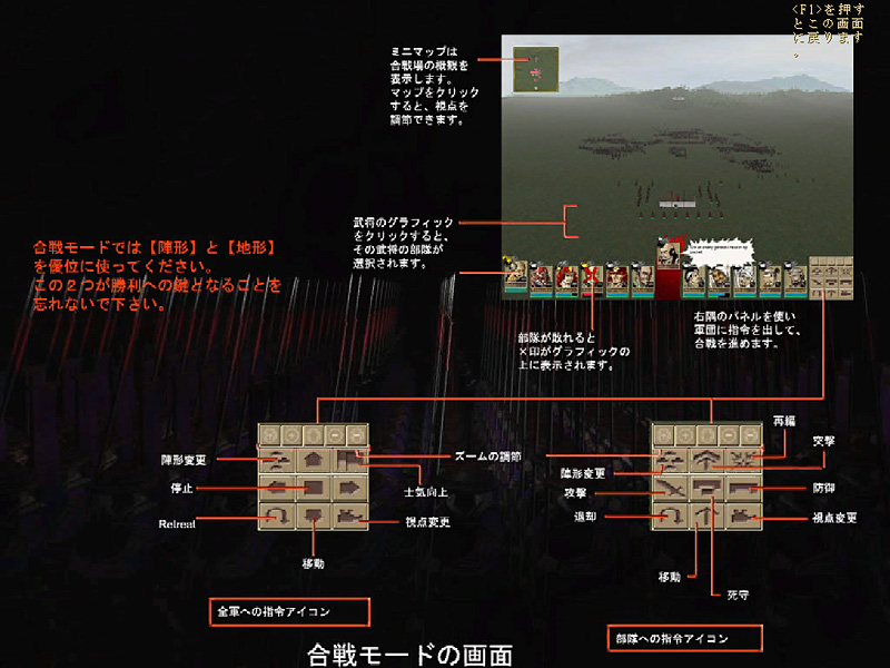 マップ上の軍団を移動させ,敵の軍団とぶつかると(もしくは敵からぶつかってくると)「合戦モード」へと移行する。合戦モードはリアルタイム制で,実在の地形データをもとに描かれた3D画面上で行われる。陣形を駆使して敵を撃破するのが目的で,勝敗が決すると再び戦略モードへ戻り,これを繰り返して天下統一を目指す。