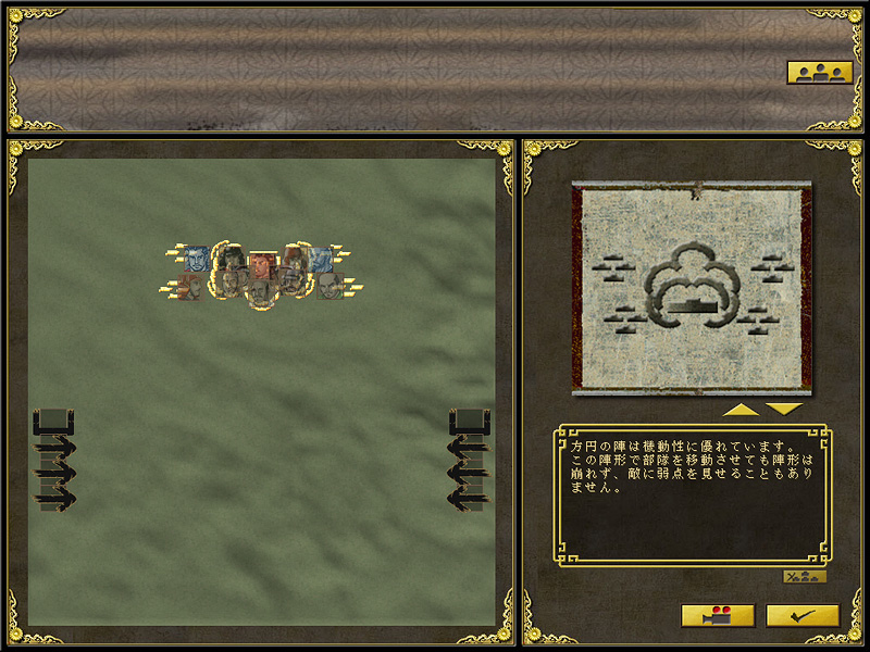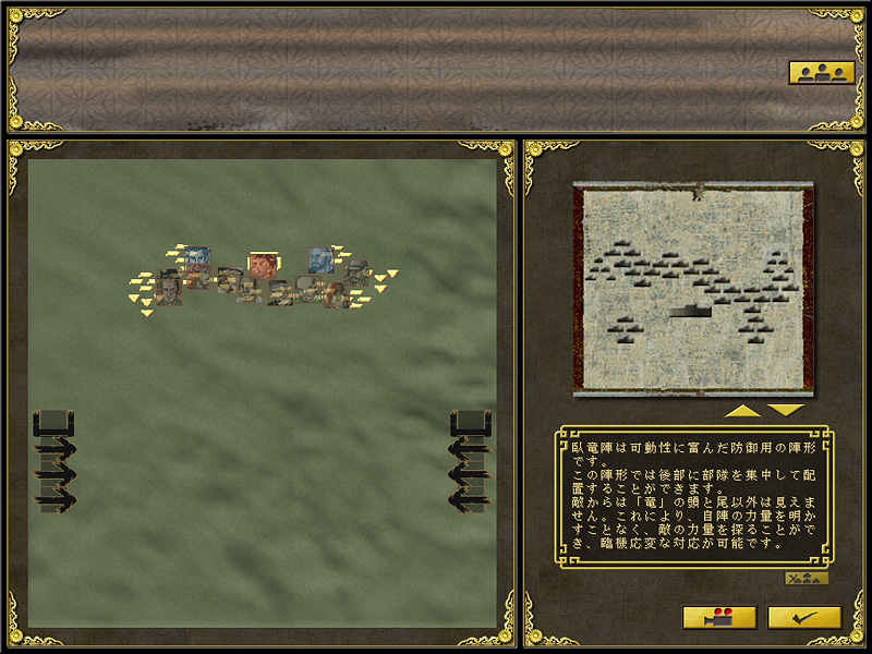 | 陣形を三つ紹介。左から「鶴翼の陣」「臥竜の陣」「方円の陣」だ。この画面では全体の陣形を選択するほか,個々の部隊の隊形も選択できる。まず全体の陣形を選んだあと,各部隊を配置する四角のマスを右クリックすると,一つ一つの部隊の陣形/向きなどを指定できる。自分のオリジナルの陣形パターンを作って保存することも可能 | ||