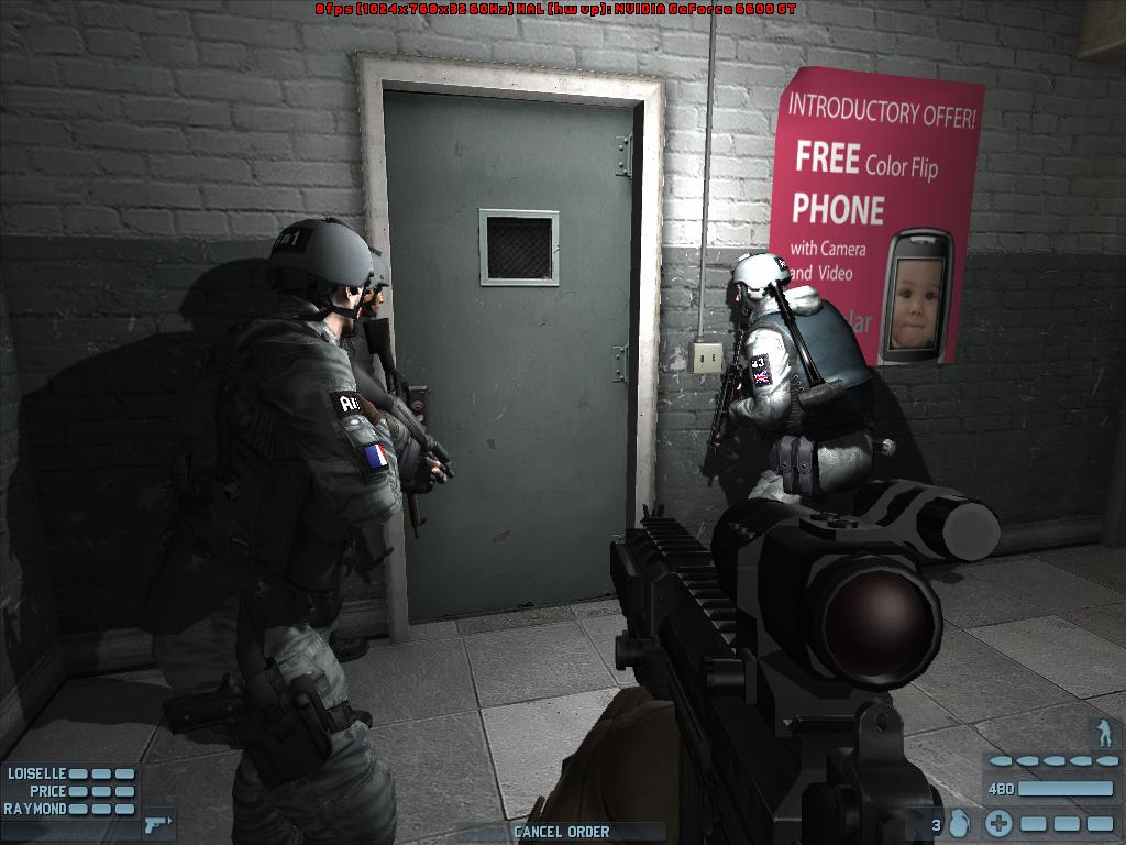 | R6で一番楽しいドア前。隊員にドア破壊,フラッシュバン投擲などの指示が出せる。右のポスターは……ゲーム内広告? | 本作ではアイアンサイトが使用可能。ちなみにデフォルトではレティクルなし設定で,ゲームオプションでONにできる | 室内のグラフィックスクオリティも見てのとおり。ちなみに一番奥の頭の薄い人は,言うことを聞かない人質。撃ちたい |