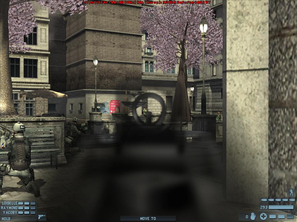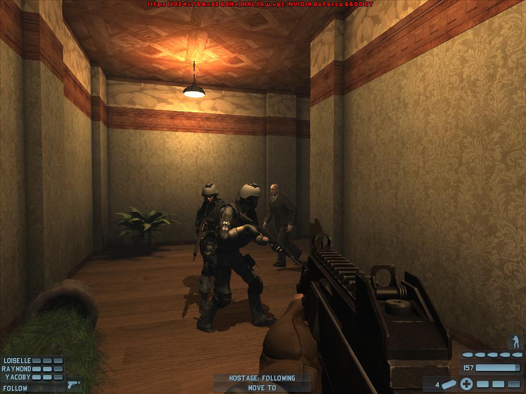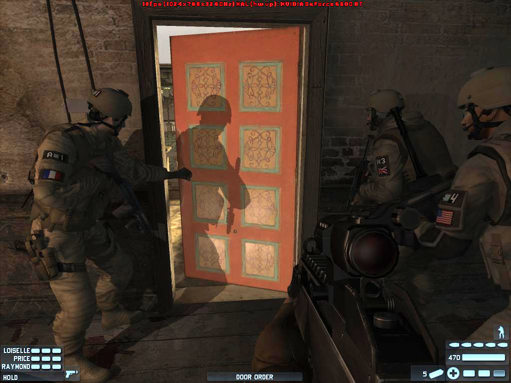 Spaceバーで移動/偵察などのコマンドを使い分けて,チームメイトが敵の視界と射線から外れるようにうまく誘導してやる。反対側に敵兵士がいるであろうドアの前に立ったら,チームを待機させてコマンドメニューから突入方法を指示。オープン(ドア開閉)→フラッシュ(フラッシュ・バン投げ込み)→クリア(掃討),ブリーチ(爆破)→クリア(掃討)といった各種突入動作で,できるだけ安全に突入を行う。