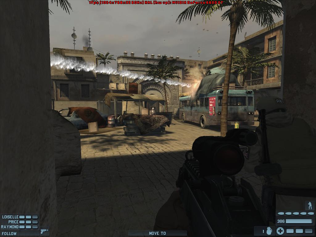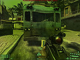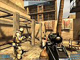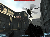 | やはりこうしたデザートチックな場所こそ戦争モノらしい。砂漠地帯では砂塵が舞い,プレイヤーの視界が遮られる | ドア前のコマンドメニュー。ブラックアローにあった,環状で直感的なリングコマンドは採用されていない | ミッションの最後はたいがいヘリでの脱出シーン。去り際にミニガンの掃射があったりして,雰囲気は良し |