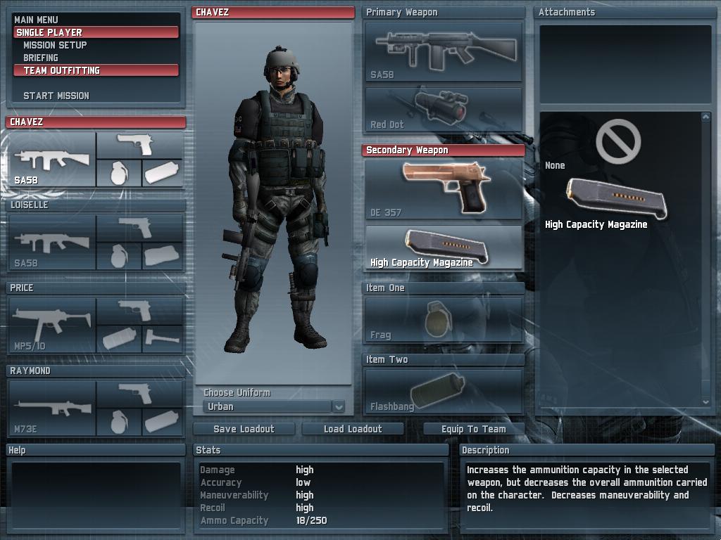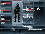 ブリーフィングでは事件の背景が語られ,突入から(必要ならば)人質救出までの道筋,そしてヘリでの脱出地点などが,見下ろしマップを用いて説明される。フィッティングでは,シャベスおよびチーム全体の武器やスーツ,各種携行兵器を選択する。武器ラインナップは相変わらず豊富で,ライフル,ピストル,ショットガン,各種グレネードなど,実在かつ現役のアイテムがてんこ盛りだ。ついでにここでチームメイトの装備も見られるが,各兵士に射撃精度や体力といったステータス的な個性はなくなっている。