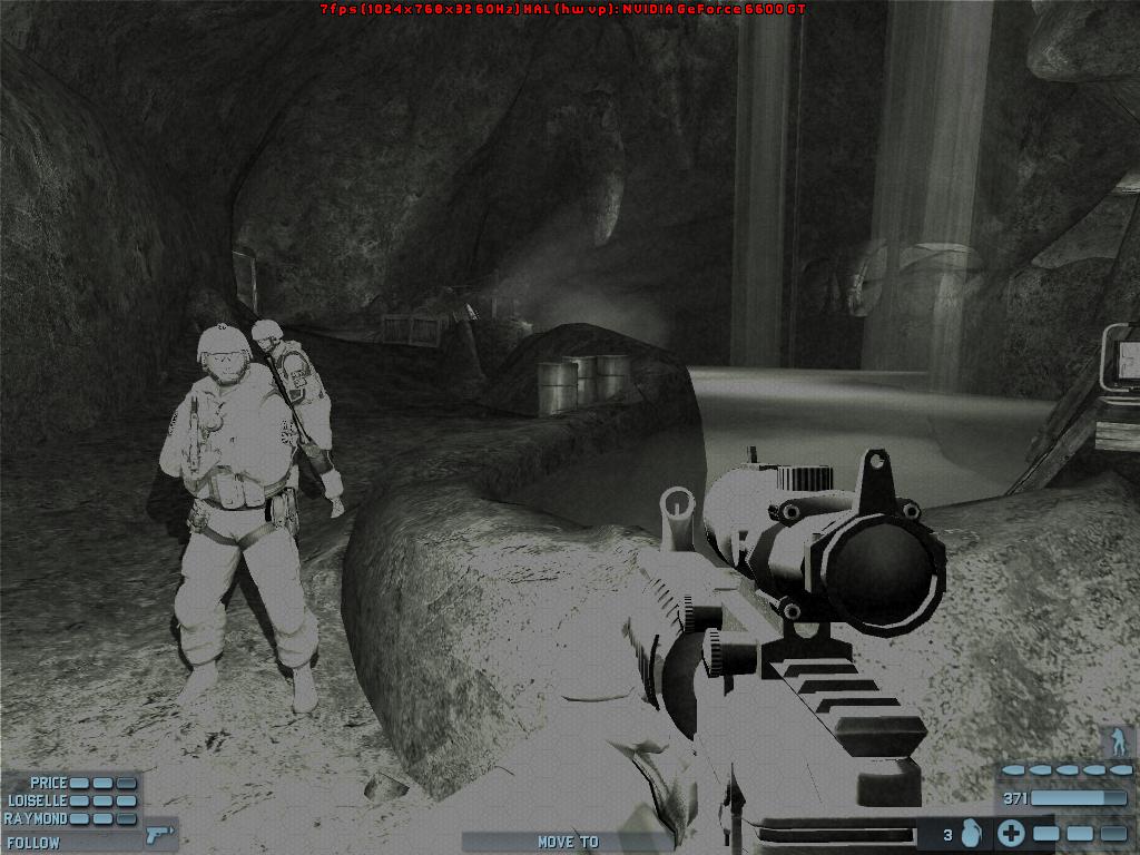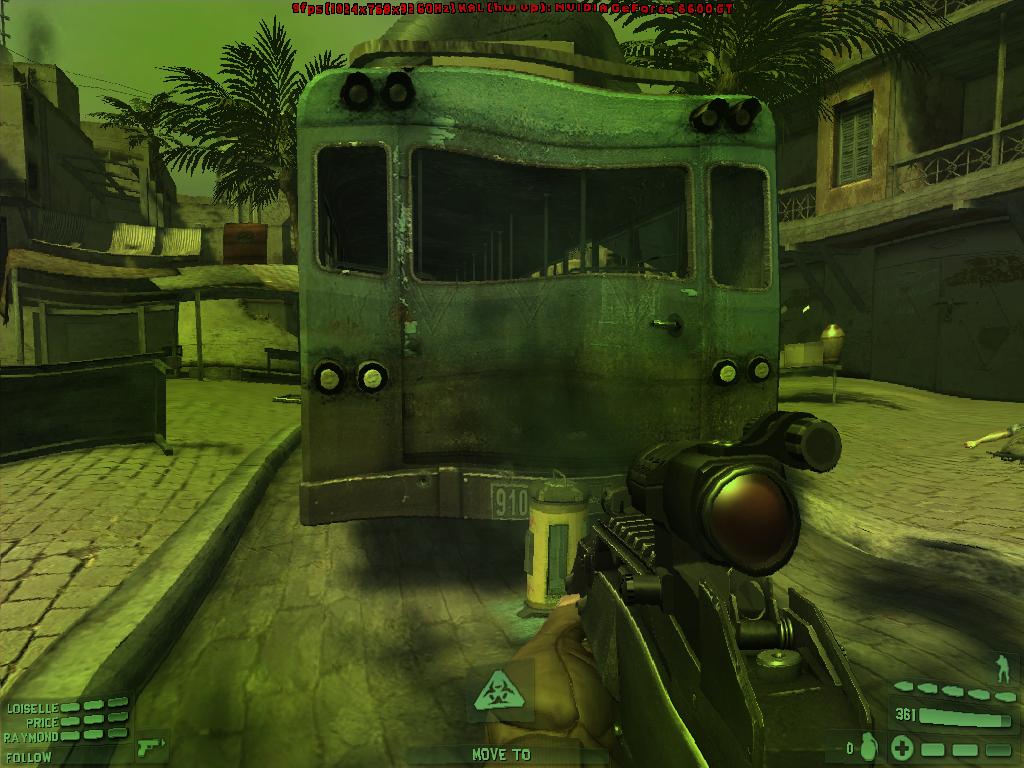 | 左から,ナイトビジョン,化学兵器によるダメージを受けたところ,そしてモーションセンサー。本作しかりスプリンターセルしかり,Red Stormおはこの視覚エフェクトはゲームへの没入感と高めてくれる。ちなみにモーションセンサーは,壁の向こう側の人間を察知できるスグレモノだが,バッテリーによる使用制限あり | ||
