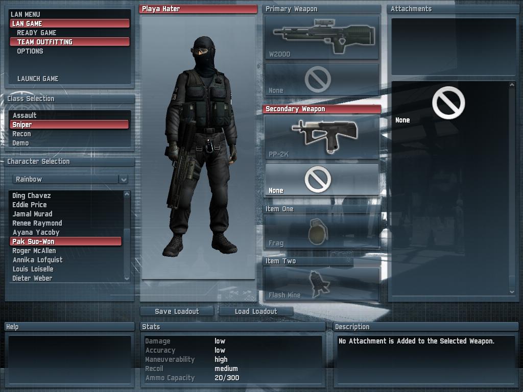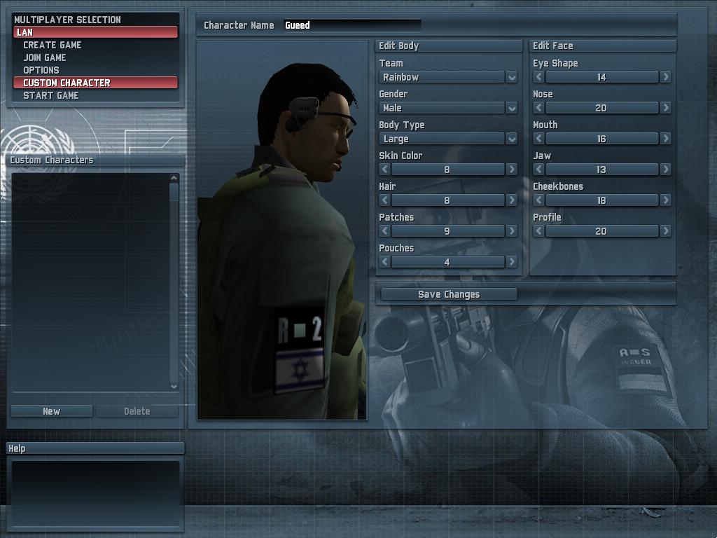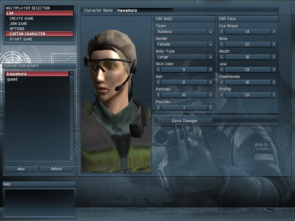 | 製品版でマルチの準備画面を撮影。「Assault」「Sniper」「Recon」「Demo」という兵科,Rainbow側では,お馴染みの隊員が選べる | こちらの2枚も製品版から。マルチプレイで使用する専用のキャラクターを作成できる。体つきや髪の色,パッチ用の国旗,また顔の細かいパーツまでが選べるのがミソ。鼻の大きさとか頬骨の出具合とか,ゲーム中にここまで見られる気がしない作り込みもミソだ | |