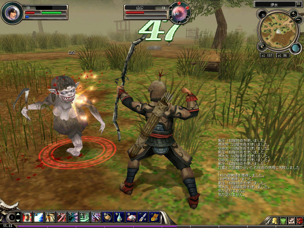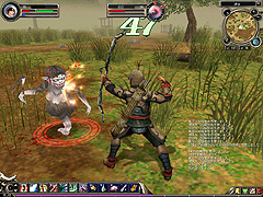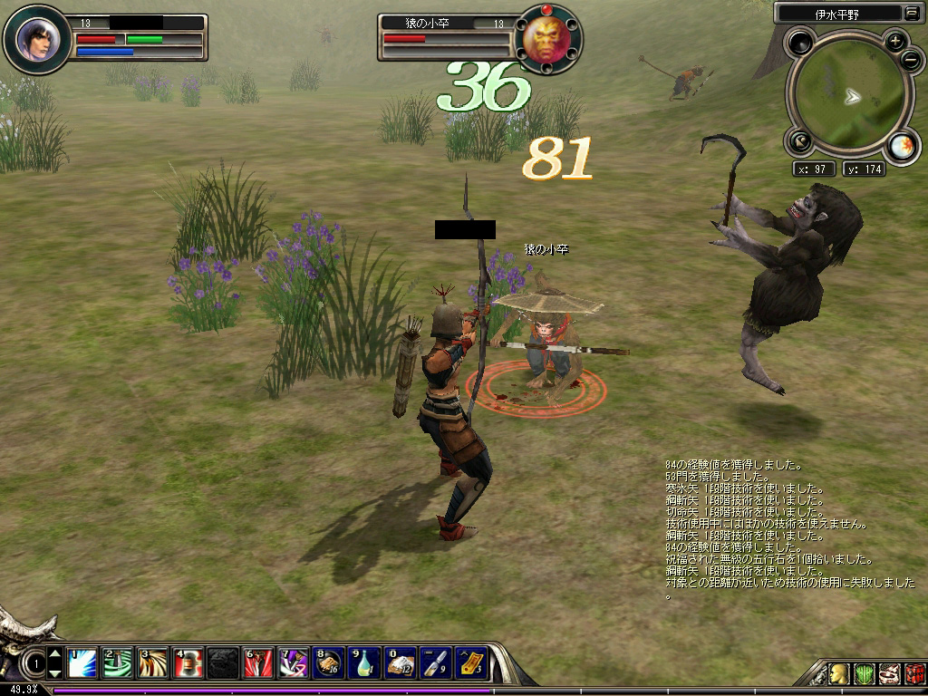 しかし,上記のようなシステムがあるにもかかわらず,戦闘は単調になりがちである。というのも,技術に関しては一旦効率的な組み合わせを発見してしまえばそれを繰り返すだけ,モンスターに関しては各エリアに数種類いるのだが,結局ノンアクティブなどの御しやすいタイプを選んで,数レベルの間ずっと同じものを狩り続けるだけという状態に陥りがちだからである。単純な時間効率で考えると,レベリングはそれほど遅くないはずなのだが,この単調さによって,かなり早い段階で飽きが来てしまう感は否めない。緊張感を高めるために,プレイヤーの各「派閥」に対する友好度変化の頻度を高くして,アクティブ/ノンアクティブの切り替えを早めるなどの調整がほしいところだ。