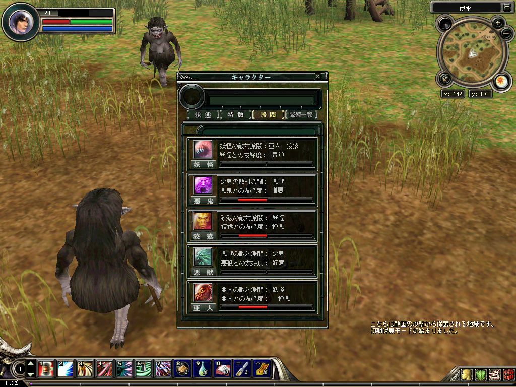| 戦士系列の職業では,攻撃を受けると,自分のアイコンの周囲に表示されている「憤怒ゲージ」が蓄積する | プレイヤーと各「派閥」の友好度の確認。友好度が低い「派閥」のモンスターはアクティブになる | 「派閥」の友好度はモンスター間にも存在する。友好度の低いモンスター同士を近づけると,MPK(対象となるプレイヤーキャラクターにモンスターを押しつけ,殺そうとする行為)ならぬMMK(?)が発生する |