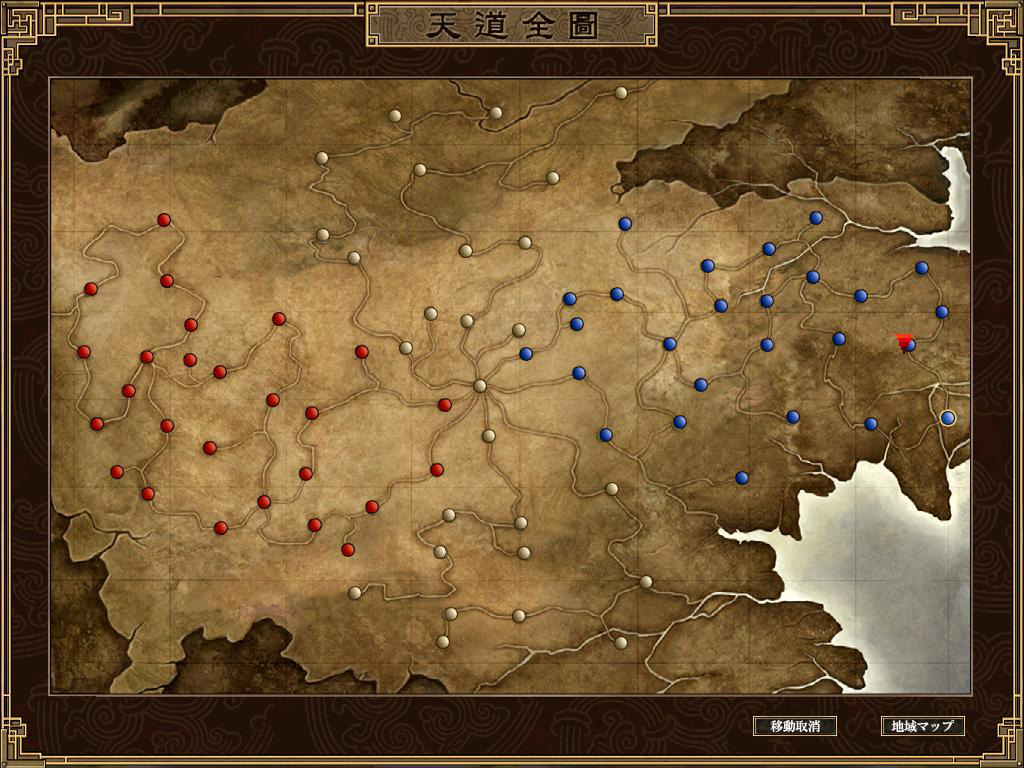 | マップ中央の白で表示されているのが中立地帯。同じく赤は「周」で青は「殷」となる。中立地帯ではレベル50以上のプレイヤー同士でPKが行われる |