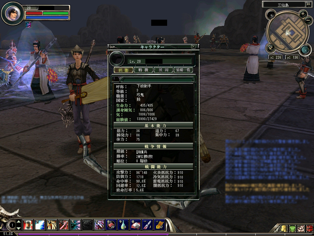 したがって当面は,自分の国家内で1対1の「比武」や集団戦の「門派(ギルド)戦」といった対人戦闘を楽しむことになる。これらは当事者同士が宣戦布告および承諾をしあうことによって開始されるため,一方的なPKにはならず,「比武」という言葉に象徴されるとおり,互いの武力を比較するという意味合いが強い。PKを嫌うプレイヤーなら,ずっと自国にいれば安全だ。