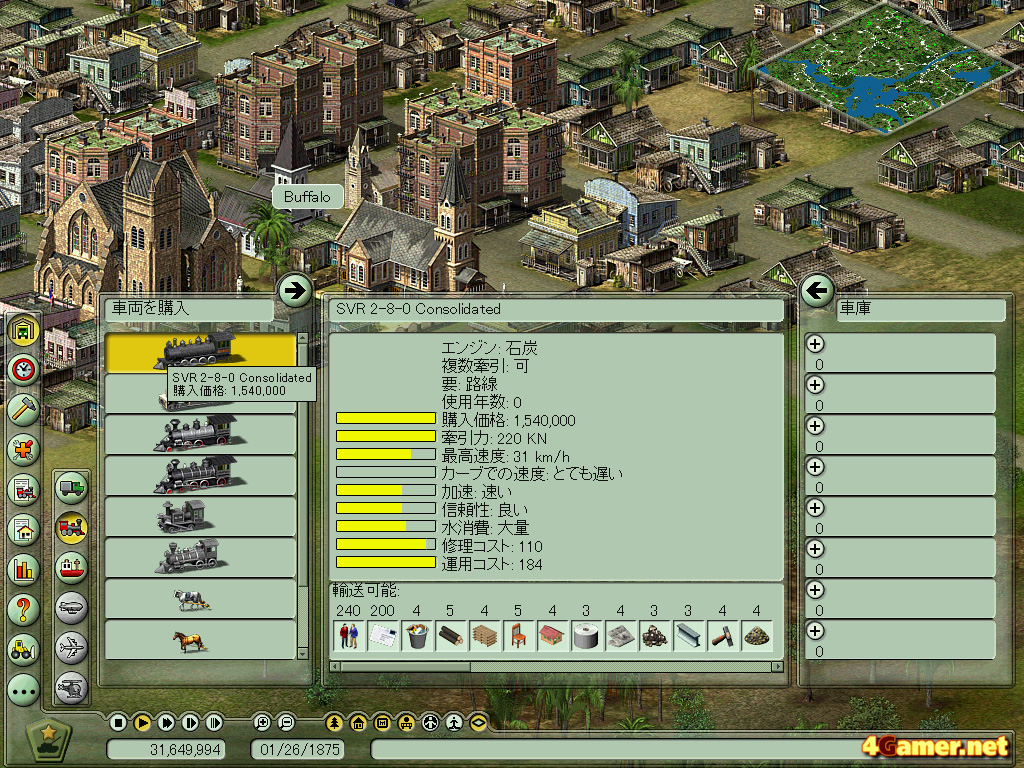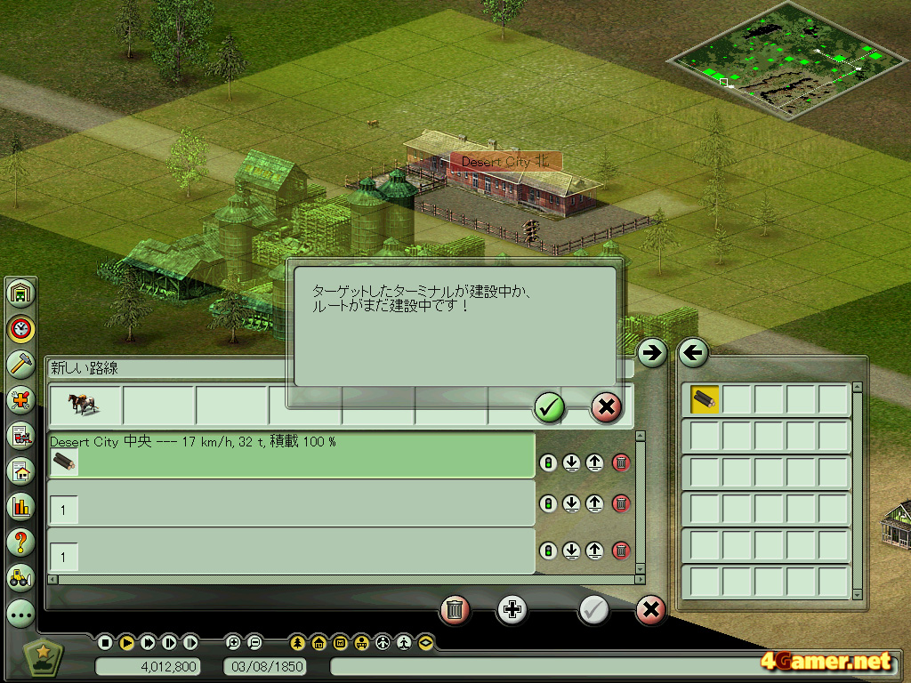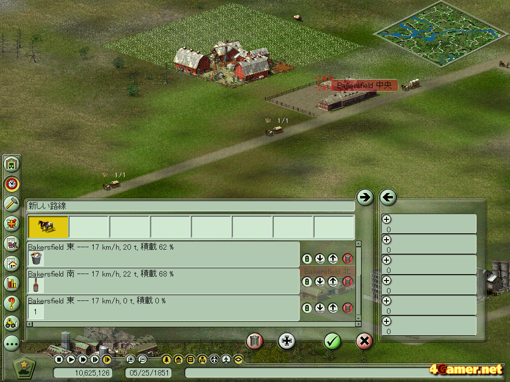 時代の背景に合わせて牛馬や列車,船舶,飛行機などを使って輸送経路を構築し,資源を工場に,また人を都市に運びながらプレイヤー企業の資金を増やすというのが目的のこのゲーム。同系統のタイトルとしては「レイルロードタイクーン」や「トランスポートタイクーン」「A列車で行こう」などが挙げられるが,本作の特色は,鉄道時代以前の牛馬を使った時代からプレイができる点だ。また妙に3D表示にこだわったり,ライバル会社を蹴落とすことに全力を挙げたりといった要素を入れず(一応競合他社の設定もできるが,正直あまり気にならない),2Dのクォータービューで箱庭をいじる感覚を味わうことにシステムを特化させた点が,個人的には小気味よく思えた部分だった。ただ,このへんはガツガツとプレイをする人には少し物足りないところかもしれない。