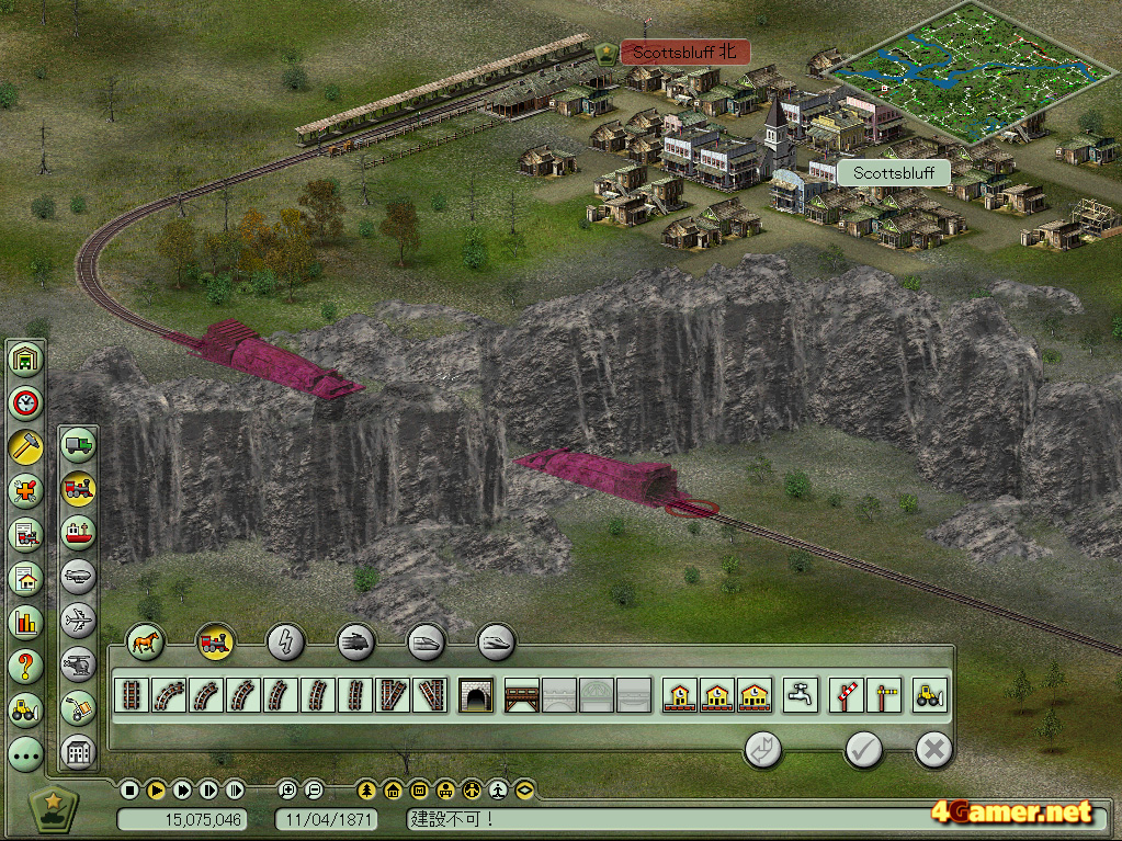 | 以上のほかにもゲームを遊んでいると不意に「橋が作れない!」「トンネルが作れない!」「路線が伸ばせない!」といった問題に直面することがある。これらは「資金不足」「路線上に障害がある」といった点で見直すと解決できることが多いが,建設できない理由を示してくれないのがこのゲームのもっとも不親切な部分だ |