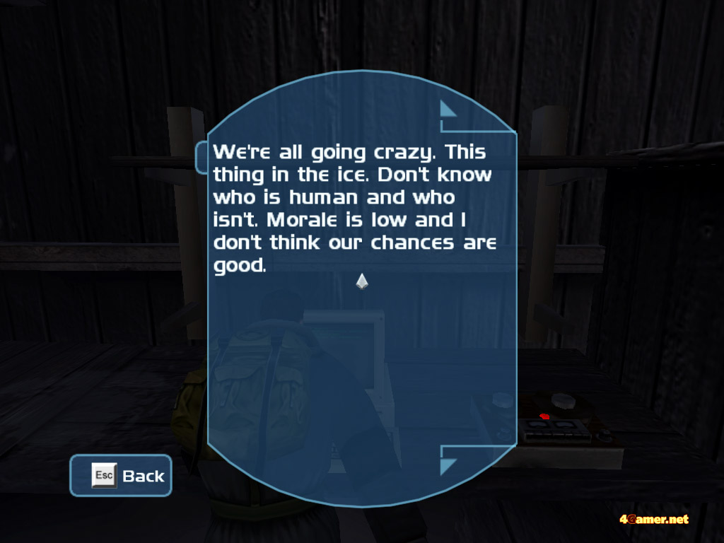 | 基地内のあちこちのPCや書類からは,事件の断片を伺わせる記述が | カメラが切り替わると,こちらをじっと伺うエイリアンが…… | 疑心暗鬼に囚われ,仲間に火炎放射器を向ける隊員も | 血液検査でエイリアンであるのがバレた(元)隊員。焼き殺せ! |