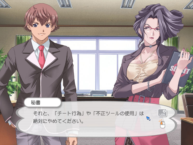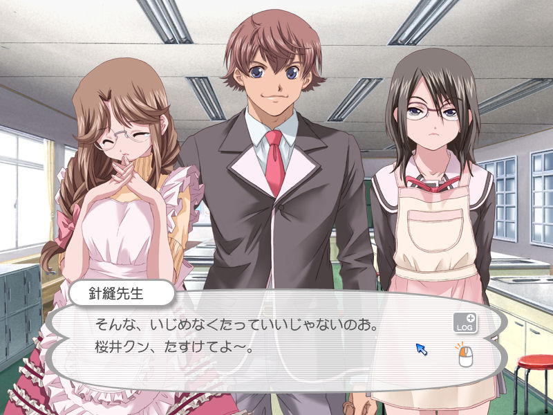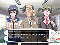 | 学校を案内している途中,家庭科の針縫先生に泣きつかれる場面も。各先生の紹介も兼ねているのだ | チュートリアル中に体験できるドラマイベントは,教頭先生が昼食中に倒れるという内容。購買部のおねえさんがキュート | 理事長の秘書。チュートリアルの最後に登場し,注意事項を教えてくれる。この服装は健康な高校生男子には凶器(狂喜?)だ |
