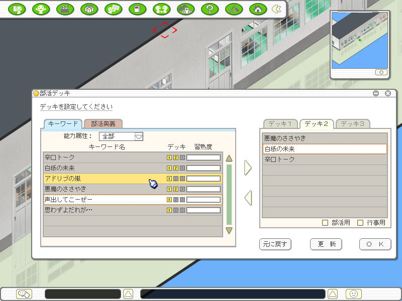 これは,カードゲームのデッキのようなもので,"クラブ活動"と"自主トレ"に必要なもの。入手済みの"キーワード"や"奥義"を"技"としてデッキに組み込み,それを駆使して戦うというシステムなのだ。