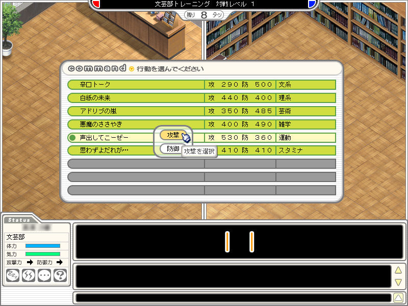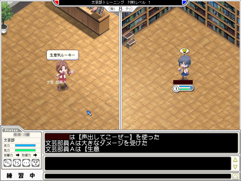 実際のクラブ活動/自主トレでの戦闘は,ターン制のRPG風戦闘。技を駆使して敵にダメージを与えて全滅させれば勝ち,というルールで行われる。クラブ活動の戦闘では,NPCの敵が二人以上出現することもあるので,強い技を入れてないとなかなか勝てないバランスとなっている。実際,敵が複数になるレベル3あたりで苦戦する人も続出していた。が,なかにはレベル31まで突破していた強者プレイヤーもいたようだ。