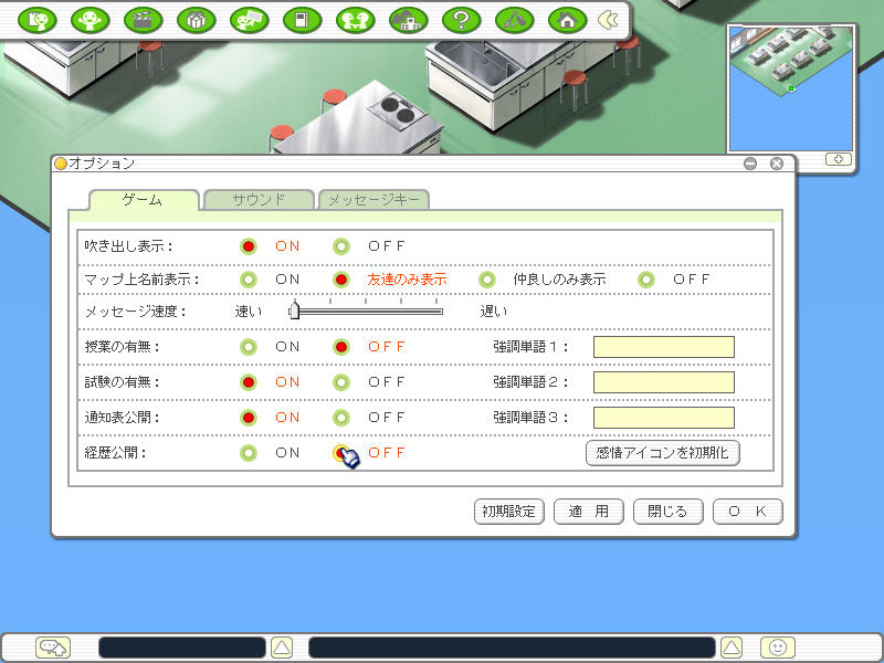 | 授業ではいくつかのお助けコマンドが使用可能。"直感"を使うとコアラ博士がプレイヤーの代わりに勘で答えてくれる | オプションでは名前の表示や,授業の有無も選択可能。チャットに集中したい人はこれをOFFにして,授業を回避していた |