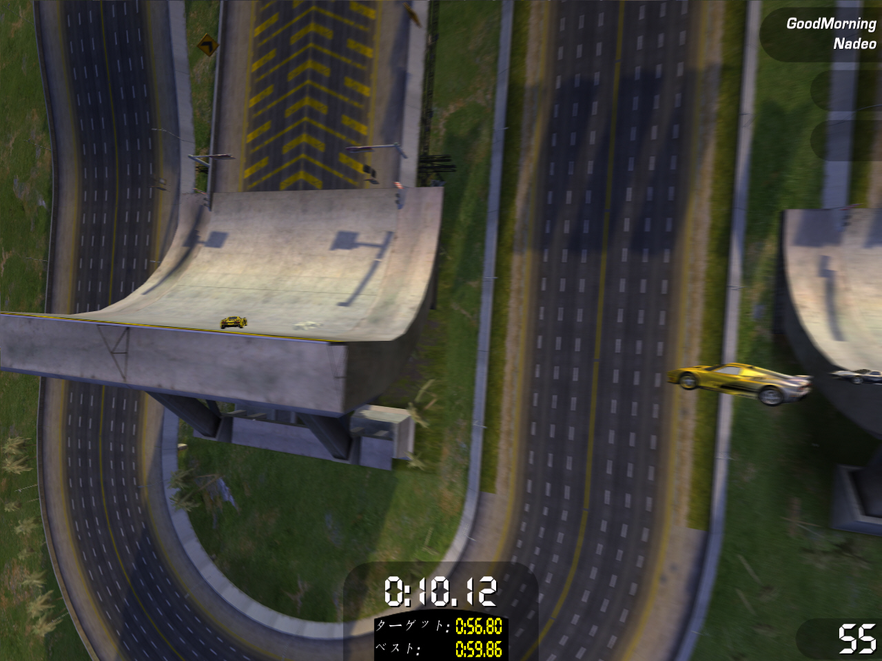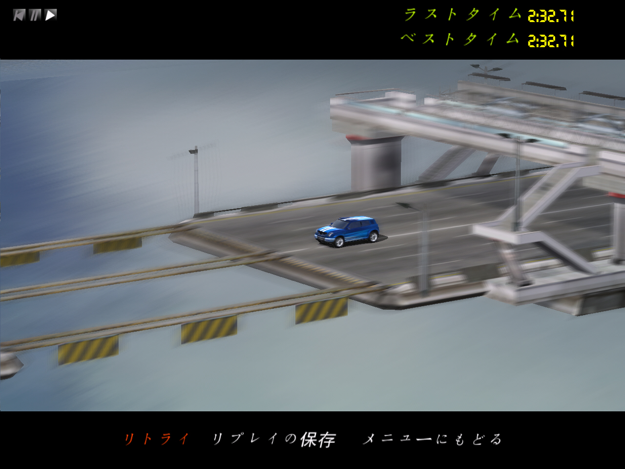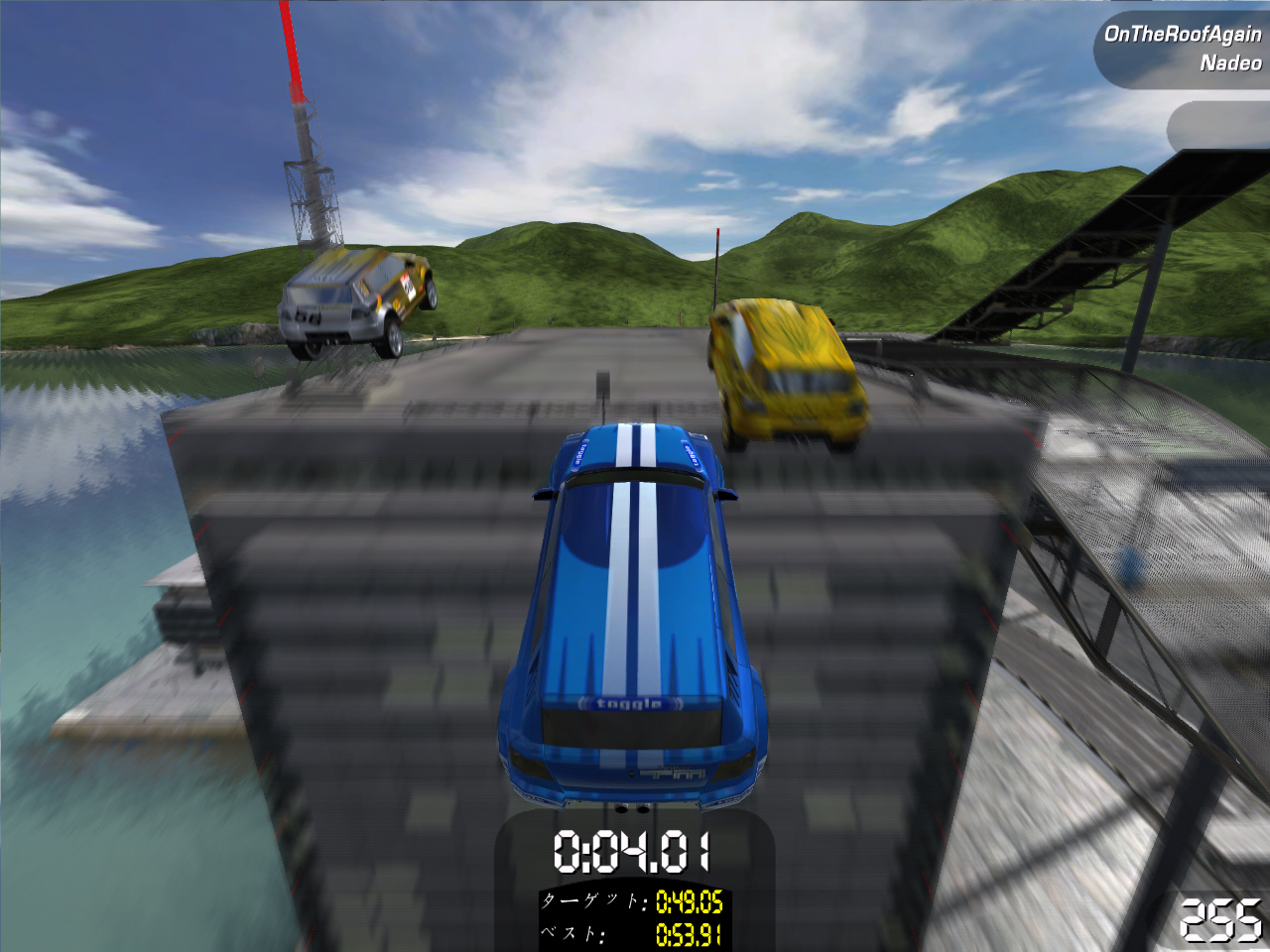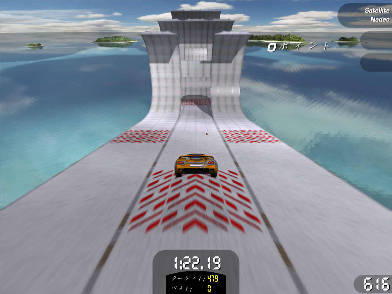 | 平行するコースへのUターンは捻りを加えたジャンプ。飛距離が足りなかったり,飛びすぎたりしないように速度と角度を調節して飛び出せ! 着地後は強制ダッシュポイントもあり,これが普通のドライブゲームではないことがすぐ分かるはず |